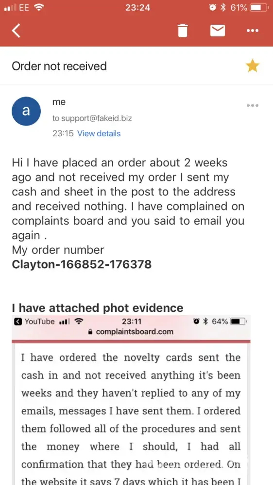 I sent €80 for 2 ids and gave 2 addresses, they were both the same but the postcode was mixed up and taken from a different address. Rather than then asking me which one to use they accused me of being the one in the wrong and asked for even more money, even though €40 for an id and this service was already way too much. I got very angry and someone called “ lisa “ was getting quite cross back. I asked for a refund many times as I seen the reviews and didn’t recieve my ids, I had been waiting on them for months and rather than them checking the address with me before they sent it they just accused me of making a mistake. Which was done by both of us! I sent them another €30 on bitcoin ( which cost me an extra €8 to buy them) and took the wallet address from somewhere on the website, can’t remember exactly where and they said they didn’t receive my money? Sent me a different bitcoin wallet address, my intentions were to send them the money however I believe they changed it so that I would send them more money again on their other bitcoin wallet.. I have lost over €150 on this horrible service and so so much time. They also had no way of proving proof that they do send and make these ids other than a picture that had no actual proof it looked like something a 5 year old child could’ve took.This is a complete utter spam and I do not recommend buying from here. Extremely unprofessional and do not know how to work with customers.