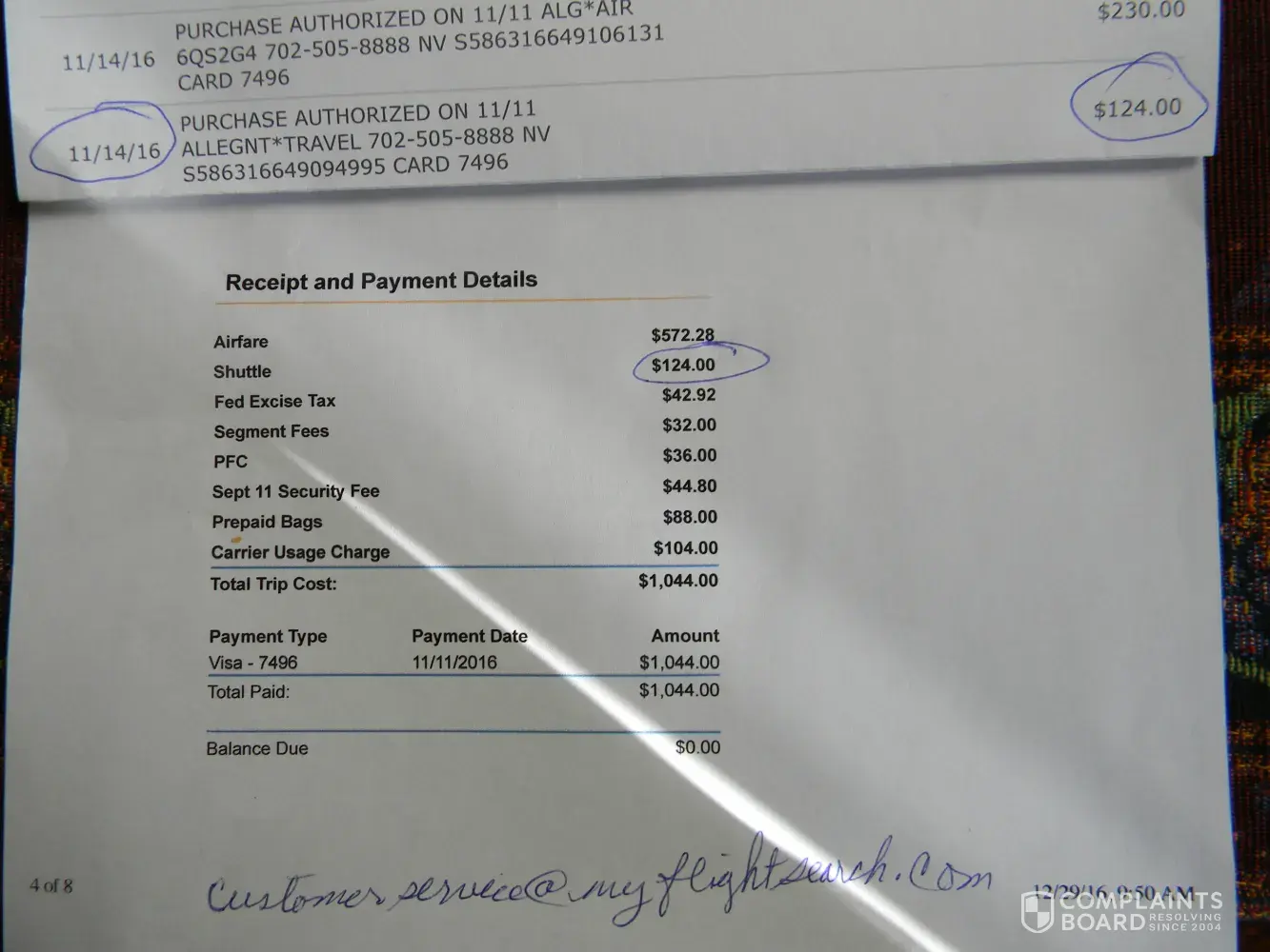 We ordered all our flight and shuttle reservations for 4 people. When we arrived in Las Vegas we went to SHowtime shuttle service to catch our ride to Westgate. We were told that our reservation was for 8 people. There has only been 4. We asked for a refund and that was a nightmare and is still not resolved. We need a check for $62 for the overage charged to us. I have the receipt from My Flight showing the overage and I have documentation that the reservation was only for 4. Please advise how to resolve this. The credit card used for these tickets is different now as we have new cards. That is why a check would be best to resolve this problem.