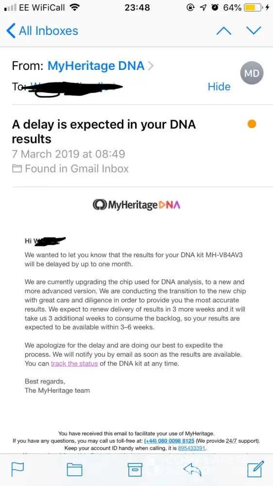 I sent my kit to the company more than two months ago and they received it on February 1st. The results were supposed to come out at the end of February and I've been eagerly checking my e-mail all this time for confirmation that they were ready. However, I've just been notified by My Heritage that my results will be delayed by a month. In their e-mail, they mention that this is due to upgrading to a new and more advanced version of the chip used for DNA analysis. Apart from the vagueness of this explanation, I feel this was an entirely predictable delay and and I should have been notified earlier on that it would take 2 months for them to process my sample from the moment they received it. When I bought the kit, their website mentioned that it takes 4 weeks with no mention whatsoever of planned delays. If I knew it would take that long, I would have bought a kit from another company. My account ID is [protected] and kit MH-74A76F.