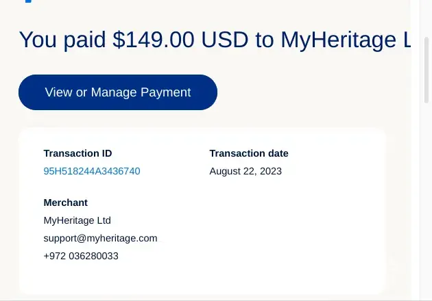 I purchased a DNA test and nothing more. I did not sign up for any subscription and I also requested that any free trial be cancelled well in advance. I was notified of a $149 charge to my Paypal account and immediately attempted to contact MyHeritage by phone. An automatic response came on asking for my account # and then it hung up on me. Any further calls from me have been blocked by them.