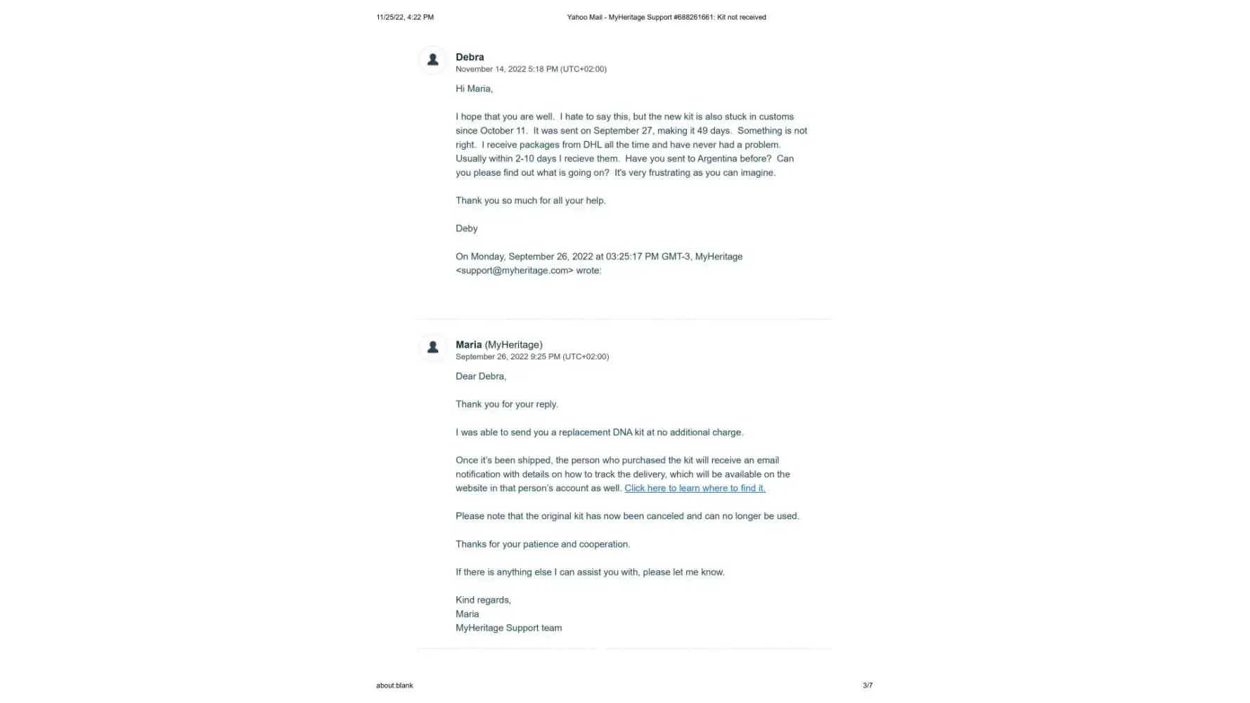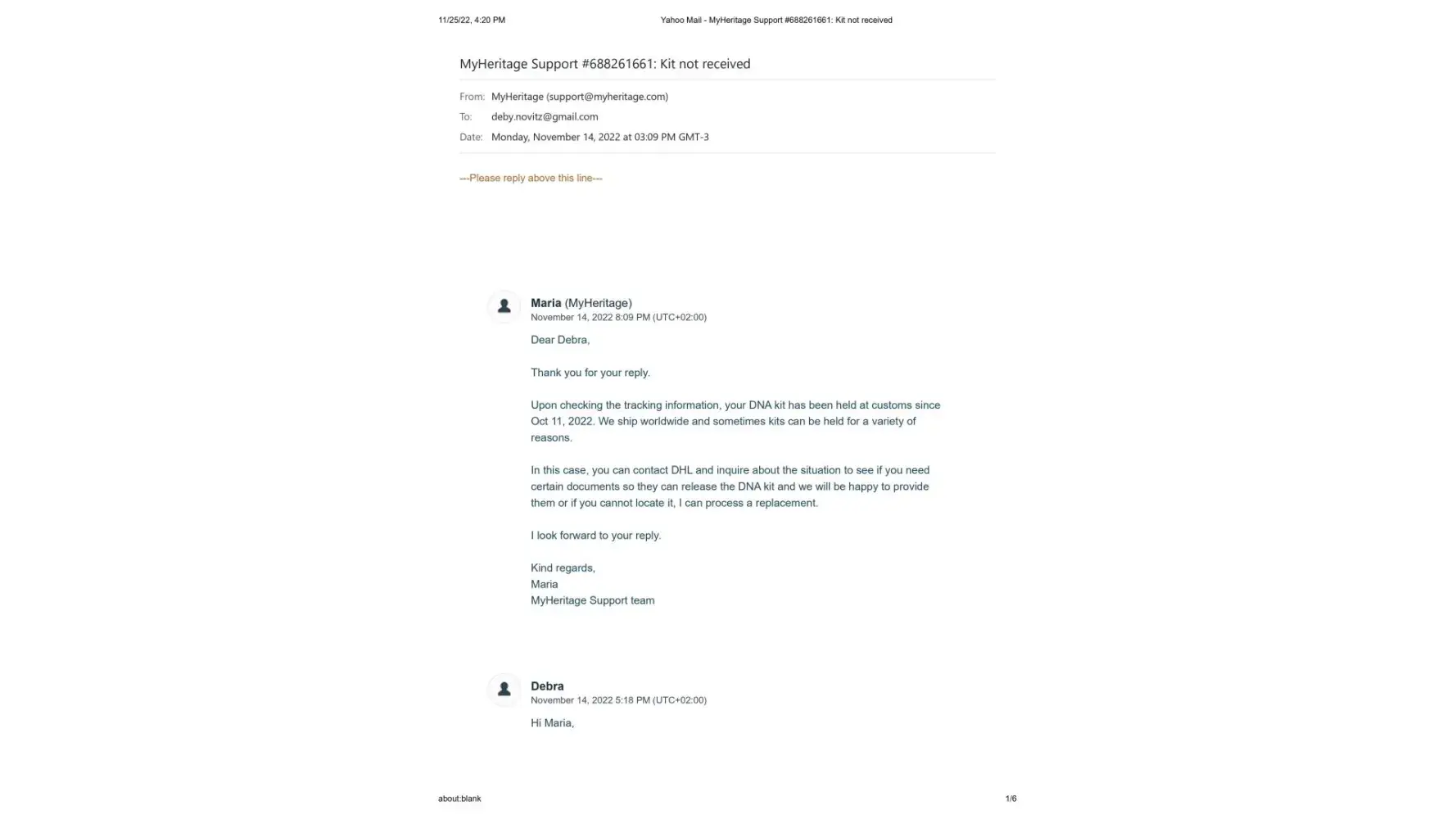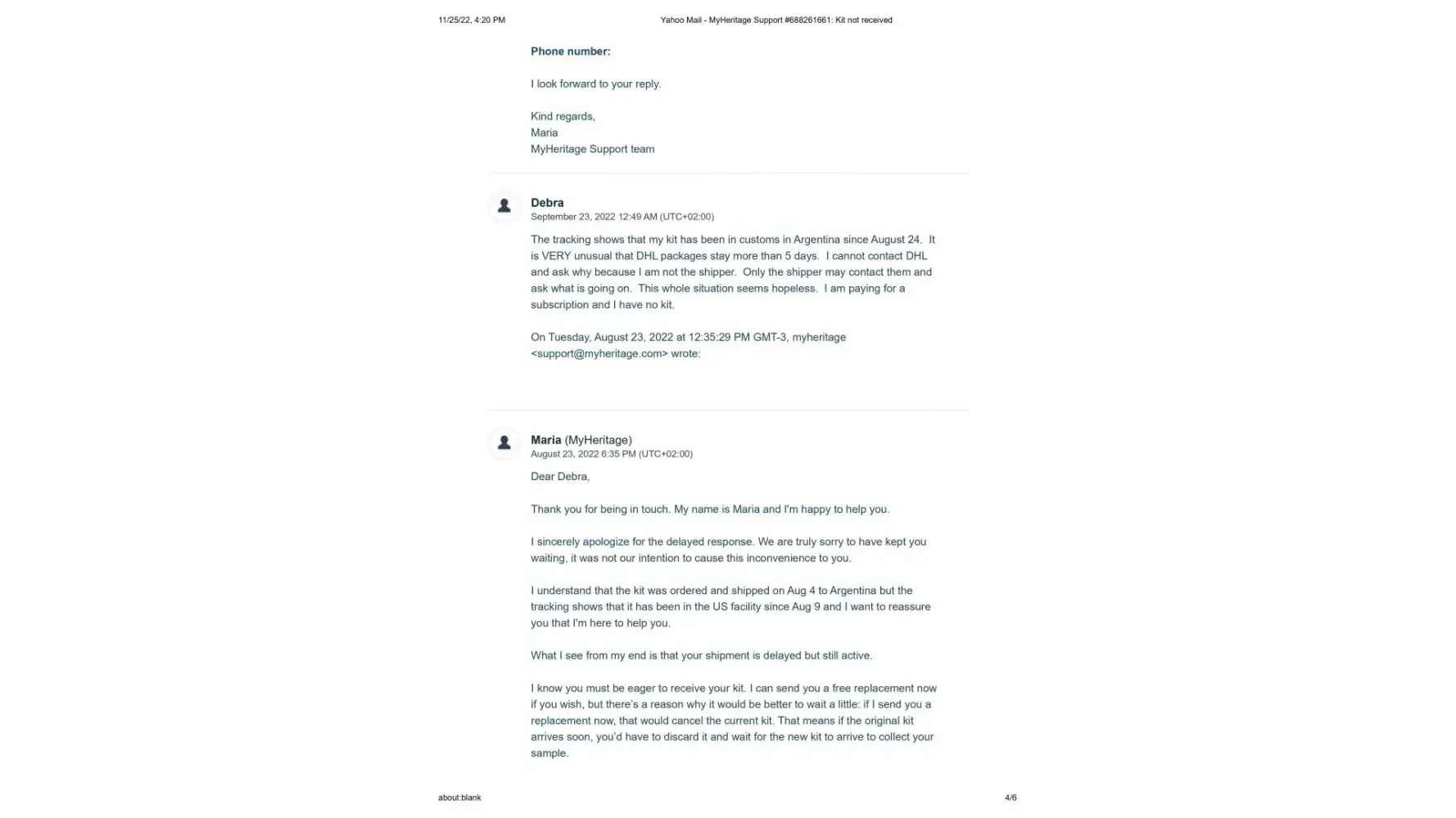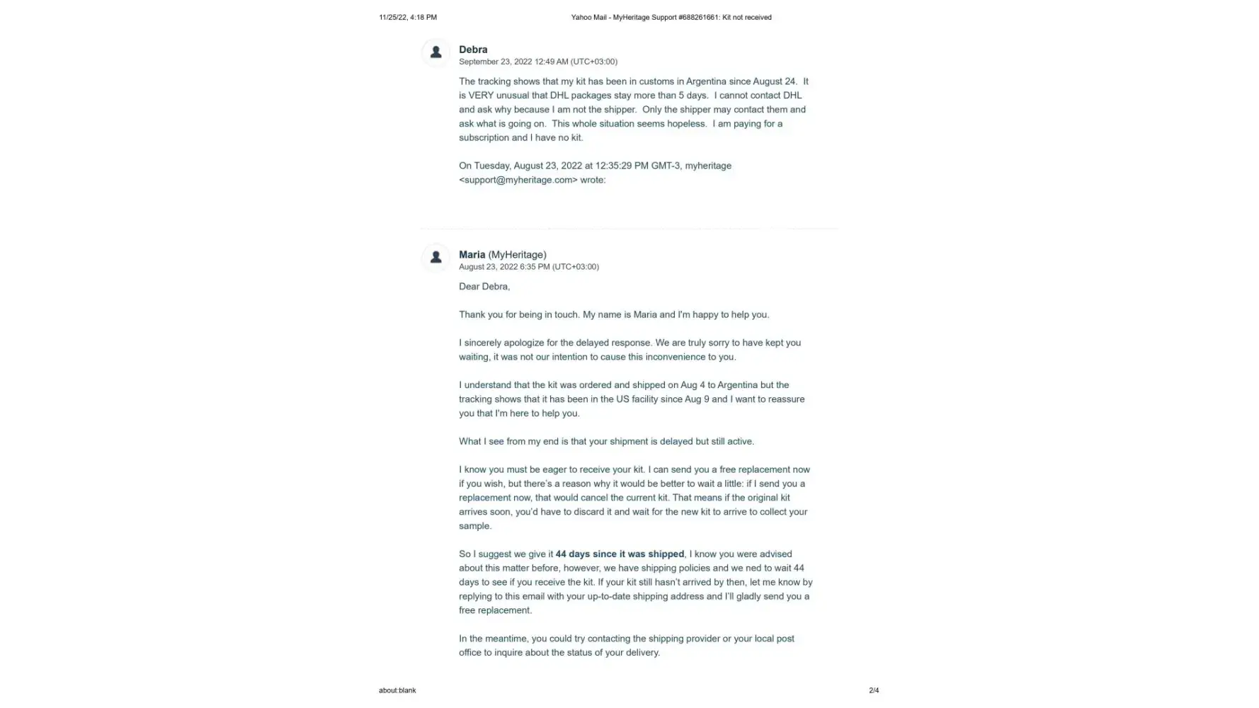 It's now November 25, 2022, 2 months since the new kit was sent, and I have still not received it. I contacted Maria once again on November 14, 2022 to let her know that the kit shows it is still in customs since October 11. (This is exactly what happened with the first kit) Her response once again was to tell me to contact DHL personally, and that sometimes there is a need for some additional documentes that they would be happy to send me. I sent Maria the cut and pastes from the DHL website where it explicitly states that the shipper must contact DHL and that if more documents are needed DHL will make contact. This also has not happened.