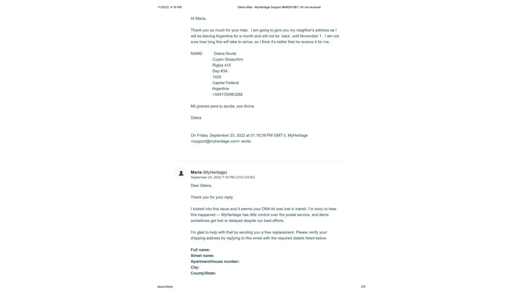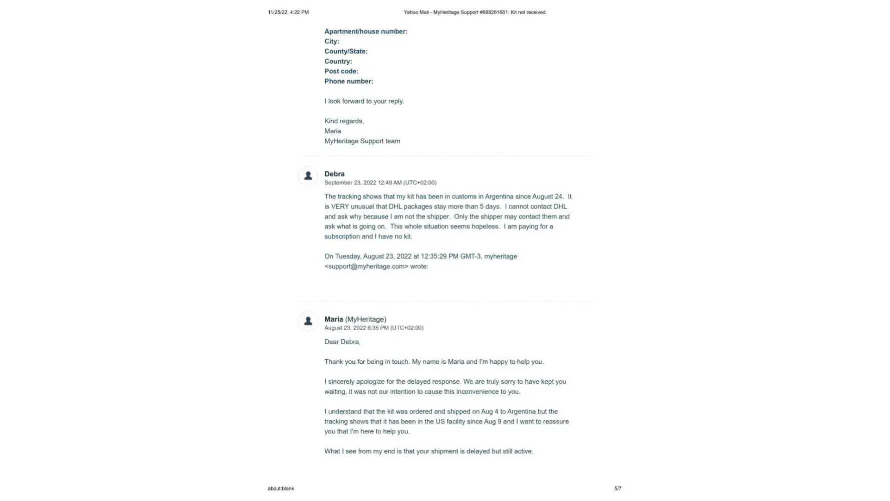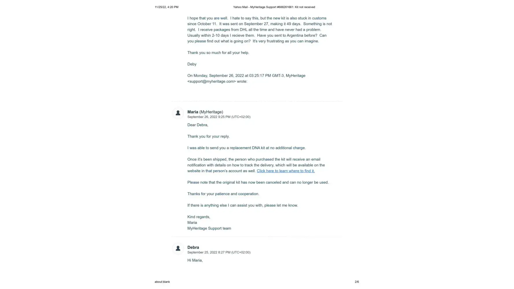 It's now November 25, 2022, 2 months since the new kit was sent, and I have still not received it. I contacted Maria once again on November 14, 2022 to let her know that the kit shows it is still in customs since October 11. (This is exactly what happened with the first kit) Her response once again was to tell me to contact DHL personally, and that sometimes there is a need for some additional documentes that they would be happy to send me. I sent Maria the cut and pastes from the DHL website where it explicitly states that the shipper must contact DHL and that if more documents are needed DHL will make contact. This also has not happened.