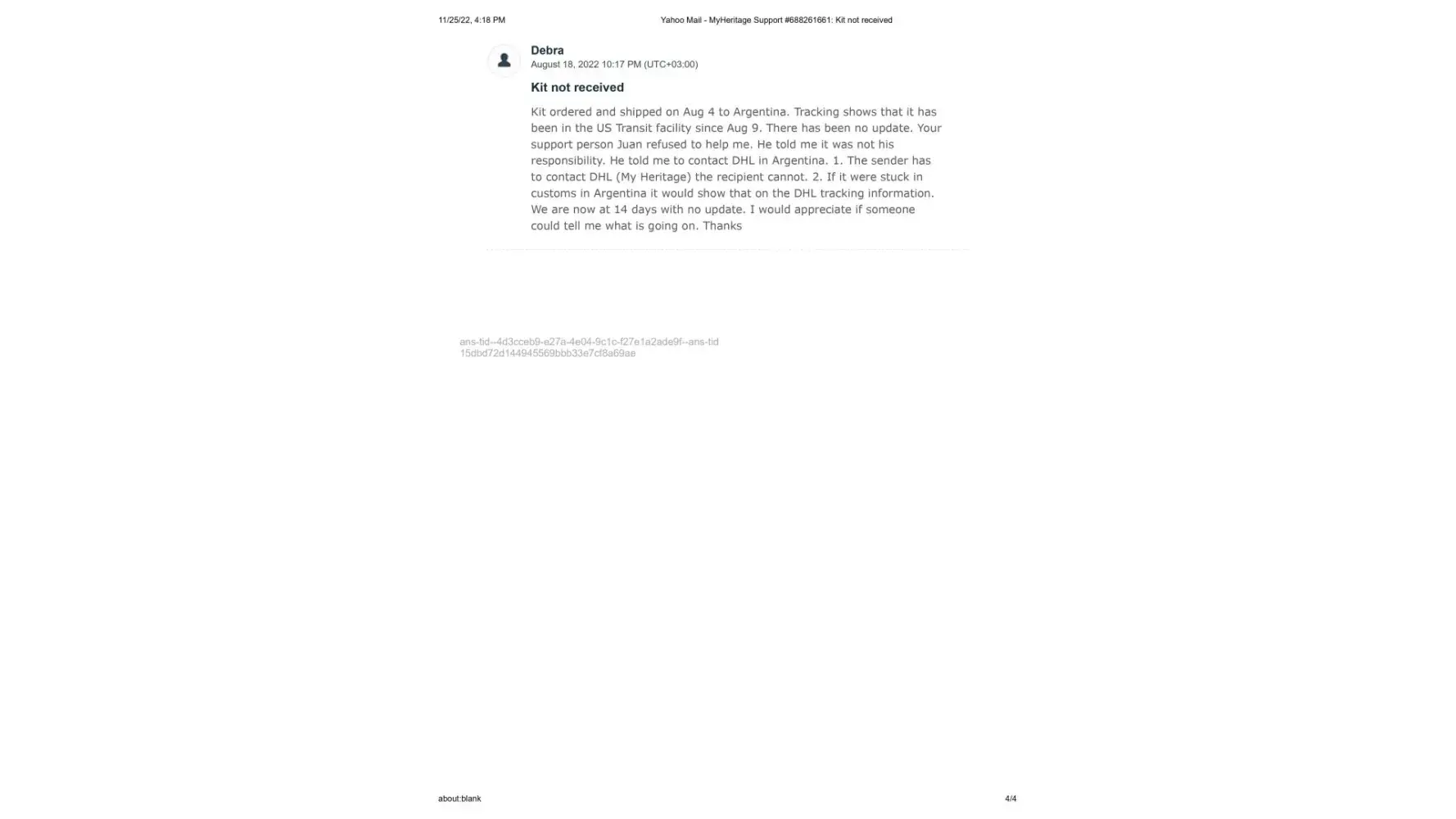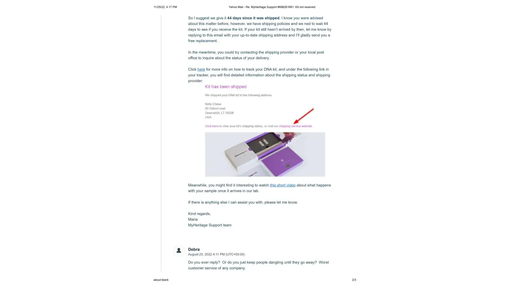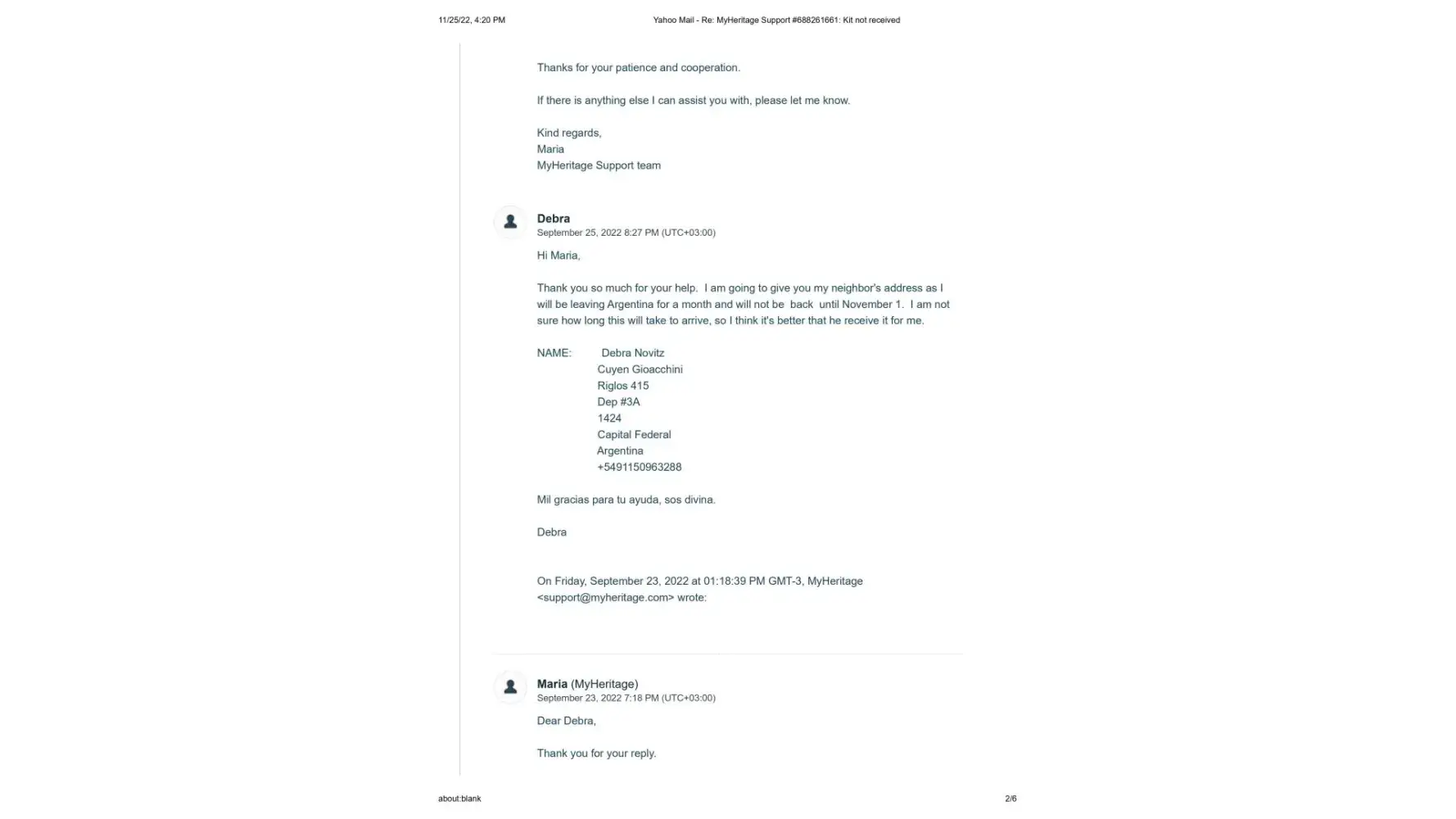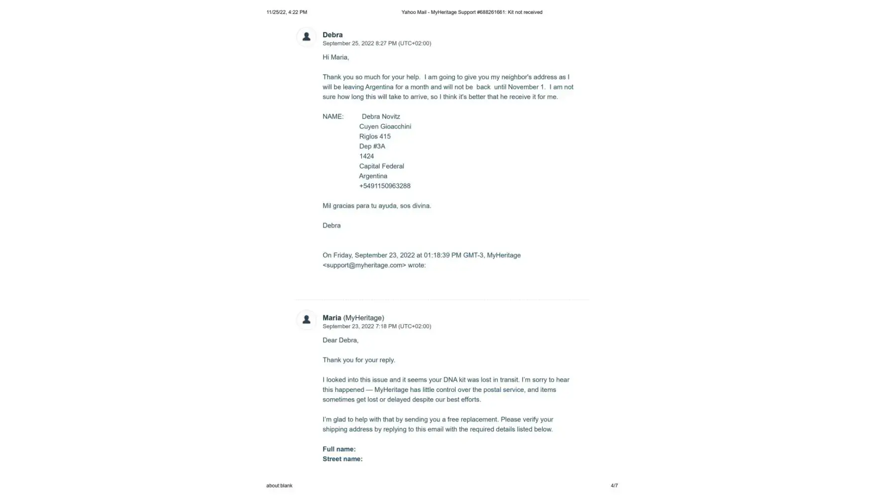 It's now November 25, 2022, 2 months since the new kit was sent, and I have still not received it. I contacted Maria once again on November 14, 2022 to let her know that the kit shows it is still in customs since October 11. (This is exactly what happened with the first kit) Her response once again was to tell me to contact DHL personally, and that sometimes there is a need for some additional documentes that they would be happy to send me. I sent Maria the cut and pastes from the DHL website where it explicitly states that the shipper must contact DHL and that if more documents are needed DHL will make contact. This also has not happened.