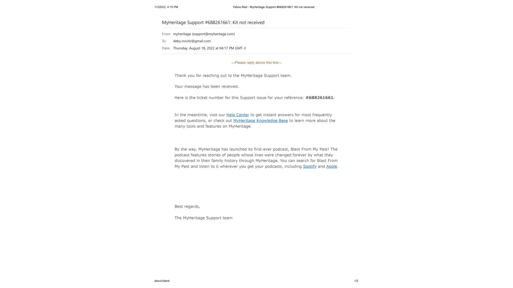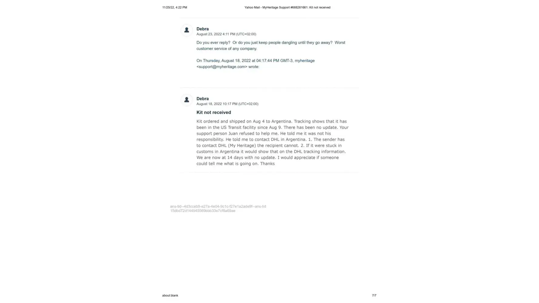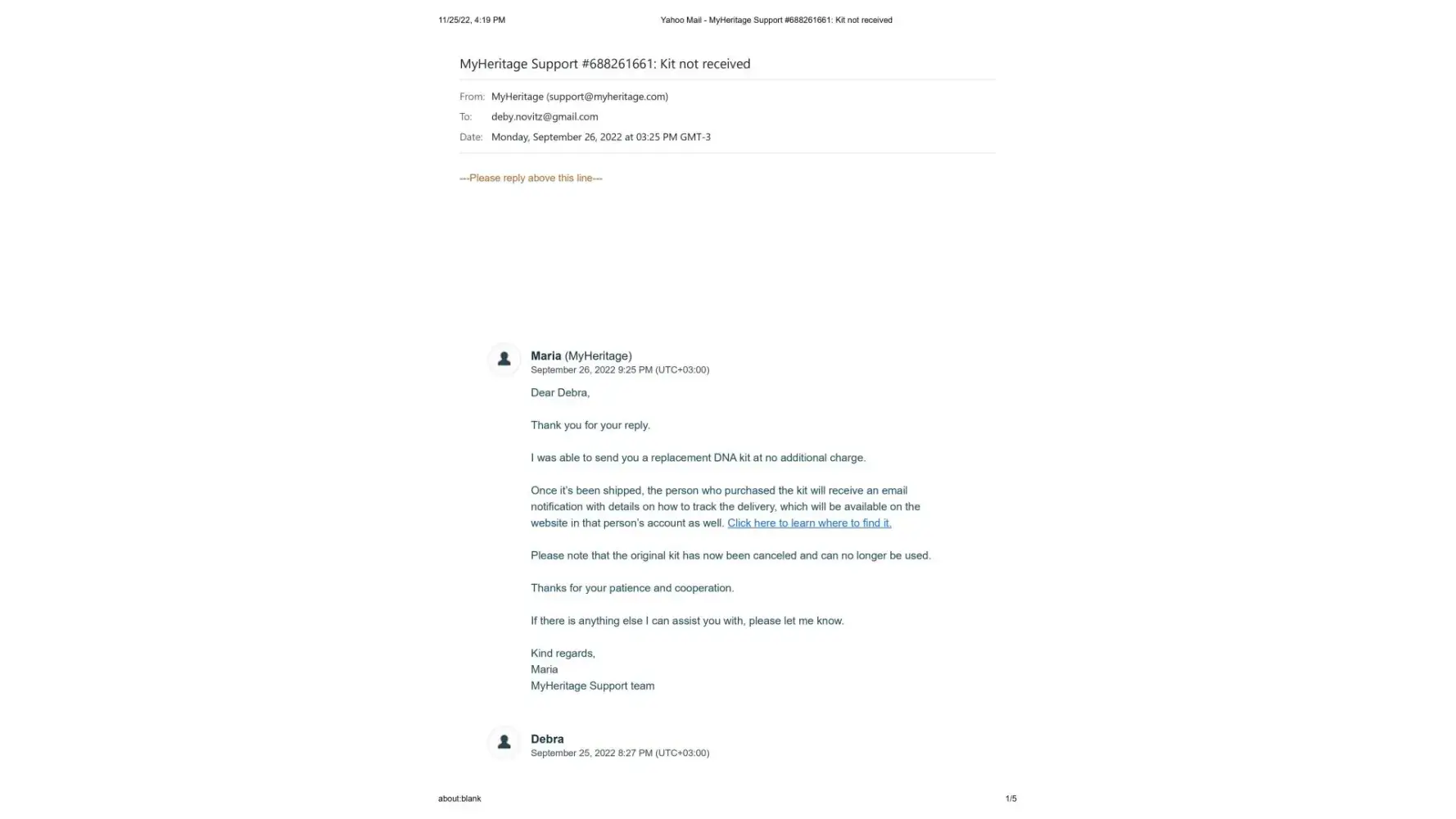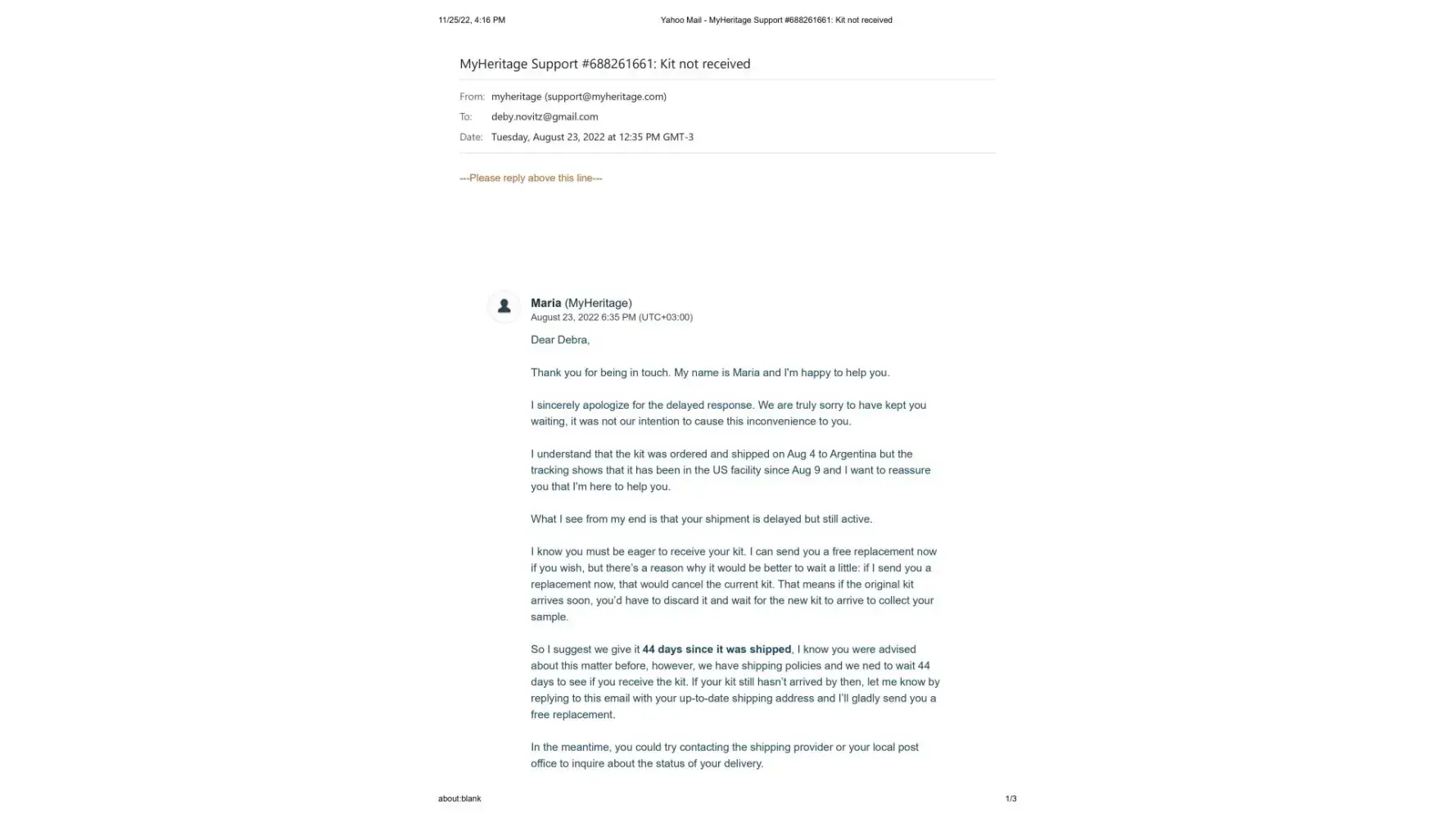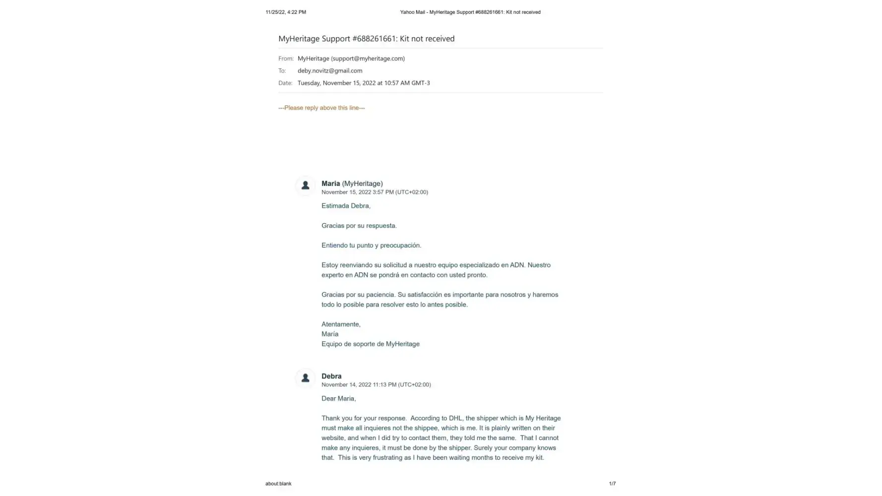 On November 15, Maria then wrote me that she was going to pass my issue on to their DNA team and they would contact me right away. I am still waiting. It's been 10 days.