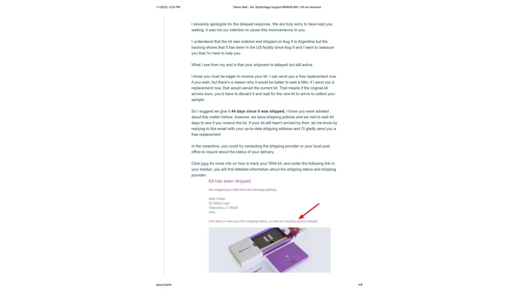 I purchase my kit on August 4, 2022. It was shipped but did not take the 12 days promised. It stayed stuck in Argentine customs according to the tracking. I tried contacting support to find out the disposition. I contacted them August 14,15, 17. When I spoke with Juan on August 19, I was told to contact DHL and see why. I informed Juan that the shipper must contact DHL, they will not speak to me. He could offer no solution other than to wait 44 days. I then tried contacting them on Aug 23. A support person Maria, sent me an email. On Sept 23 she reiterated everything she already told me including that I should contact DHL. Once again I had to explain why I could not do this. Finally, on September 25, 2022 she informed me that my kit had been lost (!) and they were sending a new one.