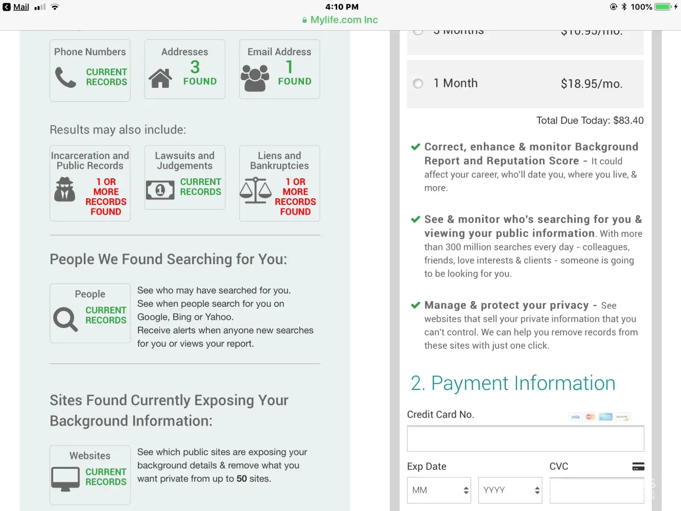 I went to search myself on MyLife.com It has wrong info on the limited report I can see. It has relatives listed I've never heard of. And the phone number shows an area code to which I have zero affiliation. And in red it states criminal activity to which is very disturbing. Yet I am supposed to pay to have it corrected or made private? Isn't this a violation of the Fourth Amendment?