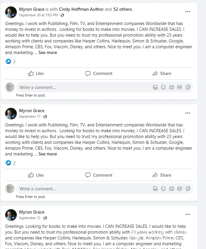 These are the same post he sent me last week and scammed me out of 500, I’m also about to publish my book. After doing some research I text him and said I wouldn’t be sending anymore money, he got very aggressive and made another profile after I blocked him and he started emailing me seven times with threats saying he sent a letter to the judge to say I’m a bad mother and told me to pay him or else. My book is about my daughter and the custody battle. I told him something private about the custody case and he tried to use to black mail me with the judge on my case. He even went as far as making a fake case number. I probably won’t see my 500 dollars again. What a scammer. I can’t believe I even fell for it. I was on the iffy side in the first place. If it sounds to good to be true it usually is.