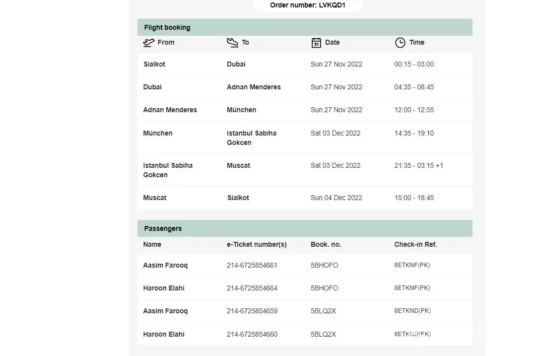 On the day of flight we had to rebook a ticket, because PIA did not let us board, because ticket was issued against IATA rules. We should get full refund for it. We cancelled as many flight we could on my ticket and not all because it was controlled by the MYTRIP service.