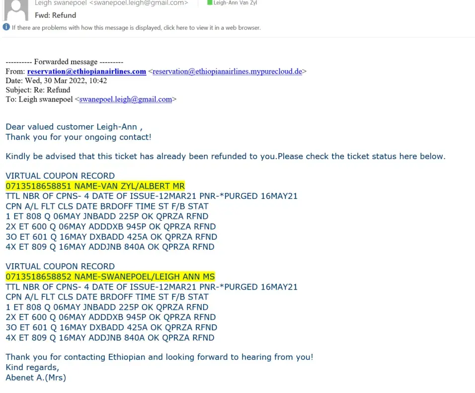 hi Jenny, may i ask? did they refund your airline ticket? it happened to me too. After i paid and confirmed, suddenly i got email that my reservation was cancelled because of TECHNICAL ERROR. I called them and they say refund is in processed.