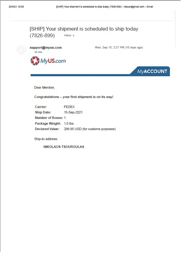 Fedex never delivered by package because MyUS gave them the wrong e-mail address for me. Further, Fedex contacted MyUS on Dec 1 for customs information and not only did they not provide the needed information, they also didn't contact me until 1 week later, which was too late and shipment was thus returned. It's impossible to contact customer service. You have to wait on chat for 2+ hours and no one answers the phone. When I finally managed to get hold of someone, they tried to blame me, and then said the matter needed to be referred to upper management and I would get a response within 1-2 business days. 2 months later and no resolution. Not a single e-mail has been received, other than emails charging me shipping fees. Last week, they attempted to ship the package back. I asked them to cancel the shipment right away and this was not done. I had to call Fedex and cancel it. The last customer service rep cancelled the chat when I asked her to resolve the issue.