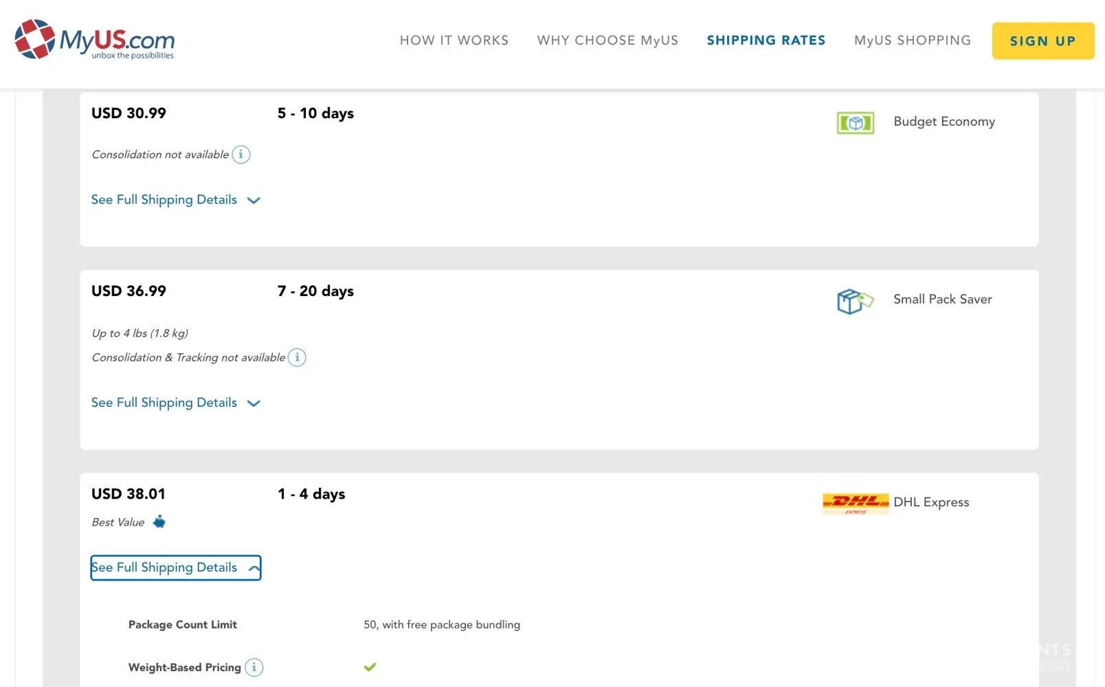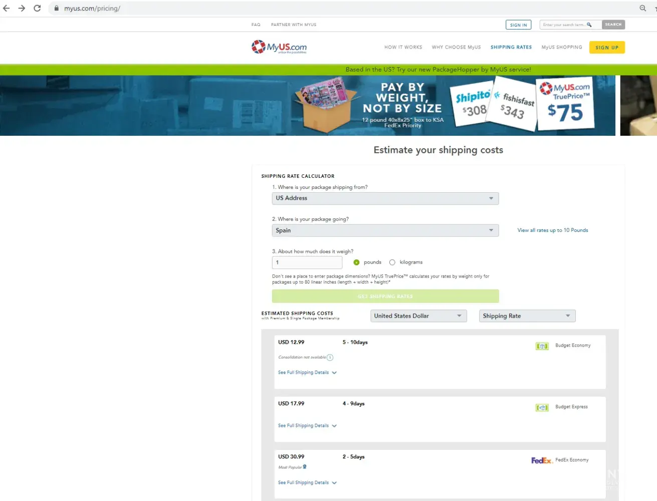 MyUS is a package forwarding service. They receive items in the US and resend to Europe. I contracted their service because I was given a replacement Bluetooth headphone-set from a manufacturer to replace a broken one. Before contracting the service, I used their shipping calculator that gave me an estimate of 33USD for FedEx Economy. See Exhibit #1. Fact...