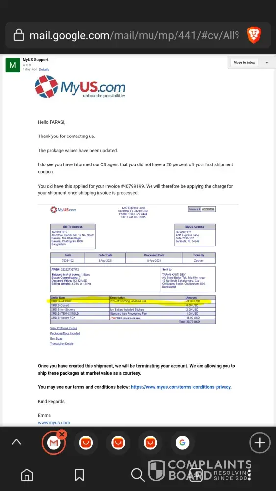 Under this case- emma agreed to provide one last chance to ship all package at market rate then suddenly closed the suite- THAT'S UNPROFESSIONAL & a company just can't stop service without prior notice