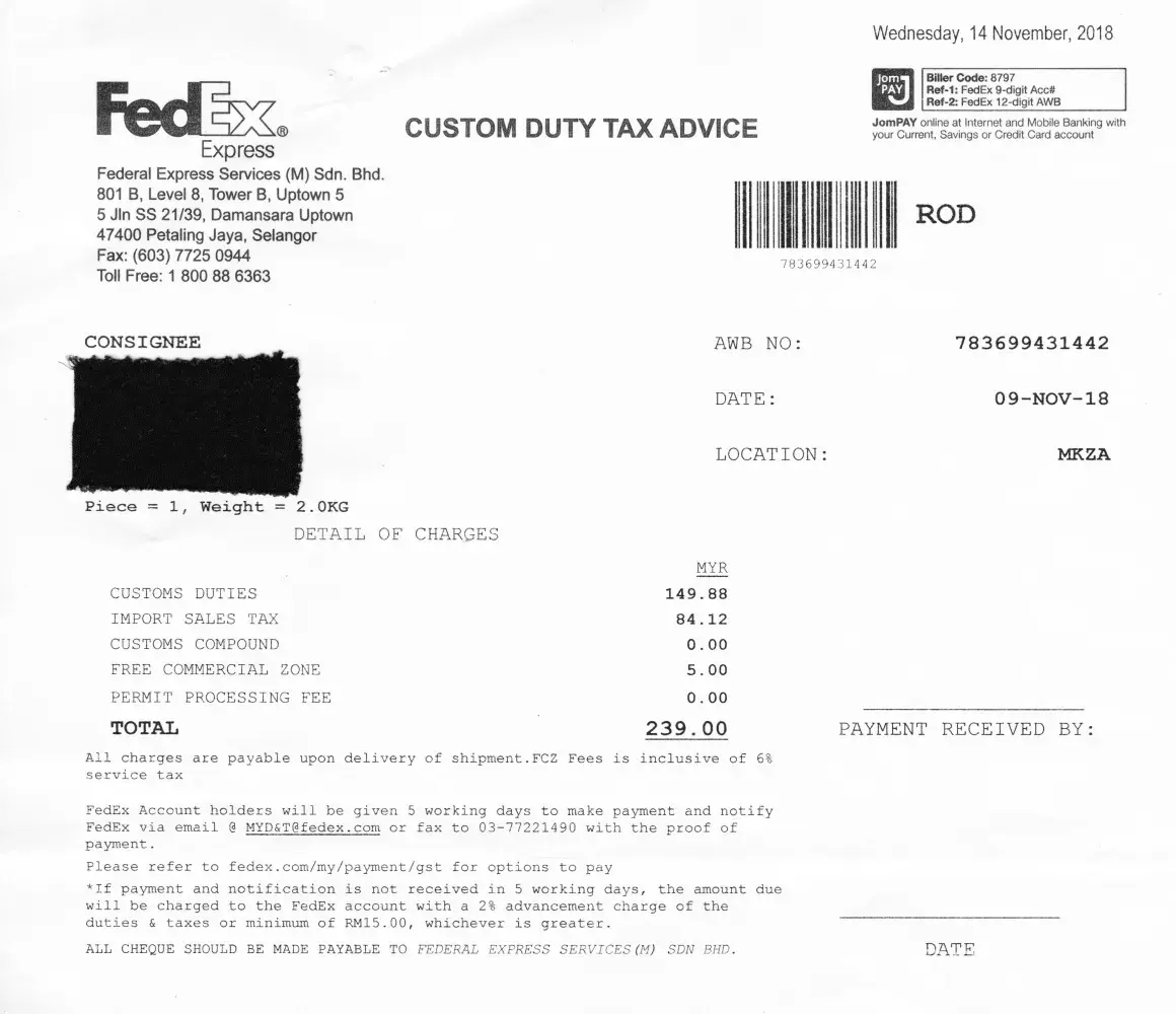 All appeals to MyUS to help resolve this fell on deaf ears and they push the problem back to the customer. By this stage, the final bill for excise and duty had been issued by Malaysian Customs and items are held by FedEx Malaysia and not to be released till every sen (cent) had been paid. What chance is there for any reduction or appeal from the customer's end?