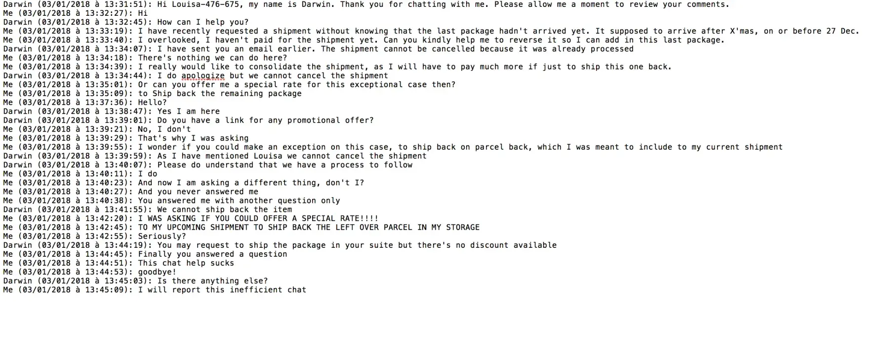 Then, the so-called 24/7 hotline, I had waited 30 mins to speak to the agent. This agent Darwin, his help is less than useless. And when you asked a question, he'd answer you with another question. And he's not responsive, not helpful. And at last, I said I would report this, he said "no worries". I believe, if I was sending this message to MyUS.com, it would probably still be him reading it. That's why he had this attitude.