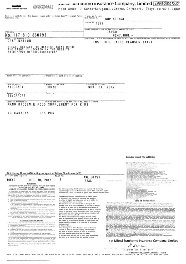 Finally, we can never be too concern if we are labelled "scammers" because Nano Japan has always maintain to offer high quality beauty and health products originating 100% from Japan except for Nano royal jelly which is from New Zealand where it has the best quality of apiary (bee) products. Nano Japan continues to be proud of our strong commitment to all valued buyers to ensure our products are truly from Japan (not only namesake) but with the best quality, effectiveness, value and at the most affordable prices we can provide. Thank you very much. For any further information, we welcome you to write to us at product@nanojapan.jp. In the meantime, we have posted here a shipping insurance for our import of Nano Biogenie via air to demonstrate the country of origin, Japan, for this product. Thank you everyone. Sincerely and truly, NANO JAPAN management