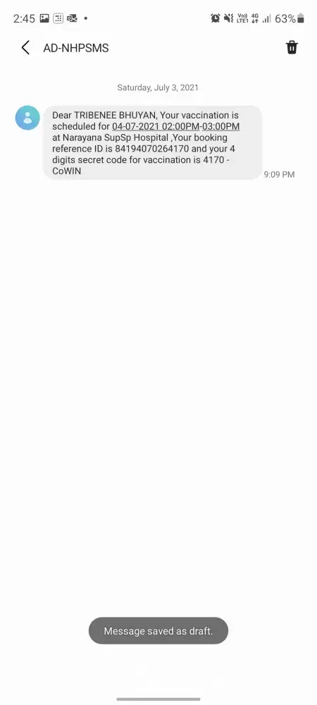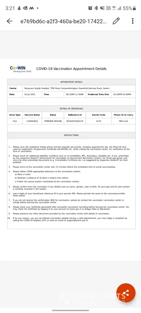 This is Tribenee Bhuyan writing this to lodge a complaint regarding vaccination not offered despite having a valid vaccination appointment in Narayana superspeciality Hospital situated in Amingaon. I was told that since today 04 July, 2021 is a sunday they are not offering vaccination. I booked the slot from cowin portal where it was showing slots available on 04 July, 2021. My slot was successfully booked and received confirmation message and appointment details.