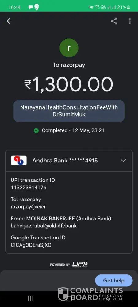 On 12th May 2021 I booked an online consultation slot for 1445 hrs of 13/05/2021 from mobile number [protected] for Dr Sumit Mukherjee, Endocrinologist of RN Tagore Hospital Mukundapur, Kolkata 700099, but the Doctor didn't turn up and as such then and there I contacted the Bangalore Office of Narayana, who promised to refund the money in my Google Pay account, but in spite of my repeated approach to them, the amount has not yet been refunded.