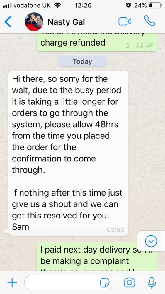 I purchased a pair of boots next day delivery on the 3rd of December at 9.10am well before cut off for next day delivery anyway they failed to deliver and said they had issues with getting orders out yet still advertising next day delivery so they were capable of sending a replacement out but did not and refused to refund. Still don't know where my parcel is or if it will ever come. Disgusting business let's put them out! And boohoo. False advertisement is illegal