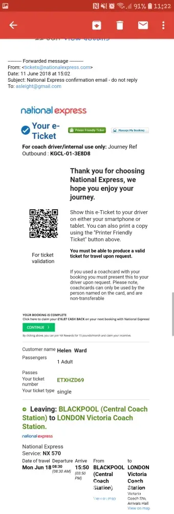 I booked myself a ticket for travel on the 22.00 national express Sunday 13th August.