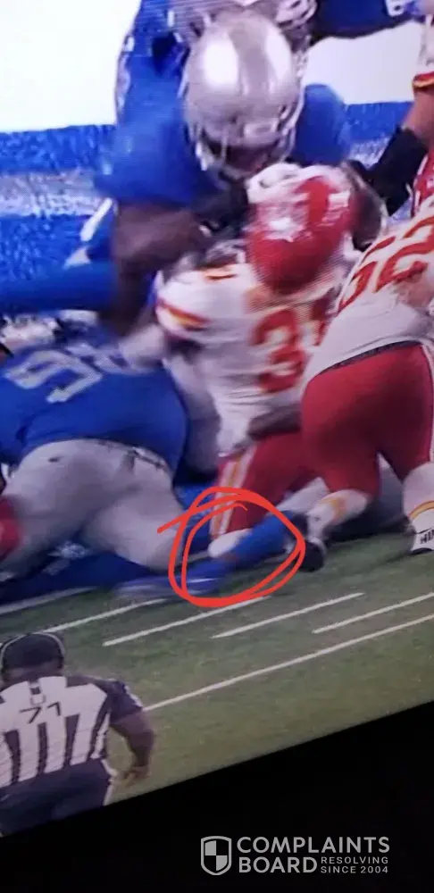 K.C. Chef's vs. Detroit Lions final play review official's missed his knee being down before he crossed the line. If you rewatch the play he was stood up at the line his knee hit's then he was pushed forward over the line for the T.D. I'm not a fan of either team but just wanted to show you this. I can't send you more photos but I'm sure you have plenty you can review.