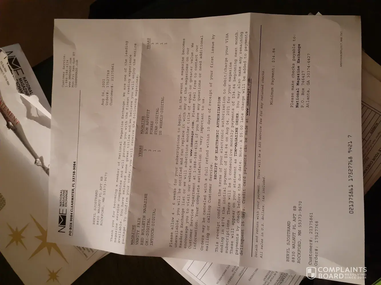 I got a letter in the mail from national magazine exchange, the letter was an entry to win $10,0000 every week for 52 weeks. In order to enter I had to confirm my address. Ticket authorization number is [protected]. It got mailed to in like mid-April 2023. The letter said I had until the 4th of May 2023 to confirm my address. The company then repeatedly harassed me about my personal credit card information.