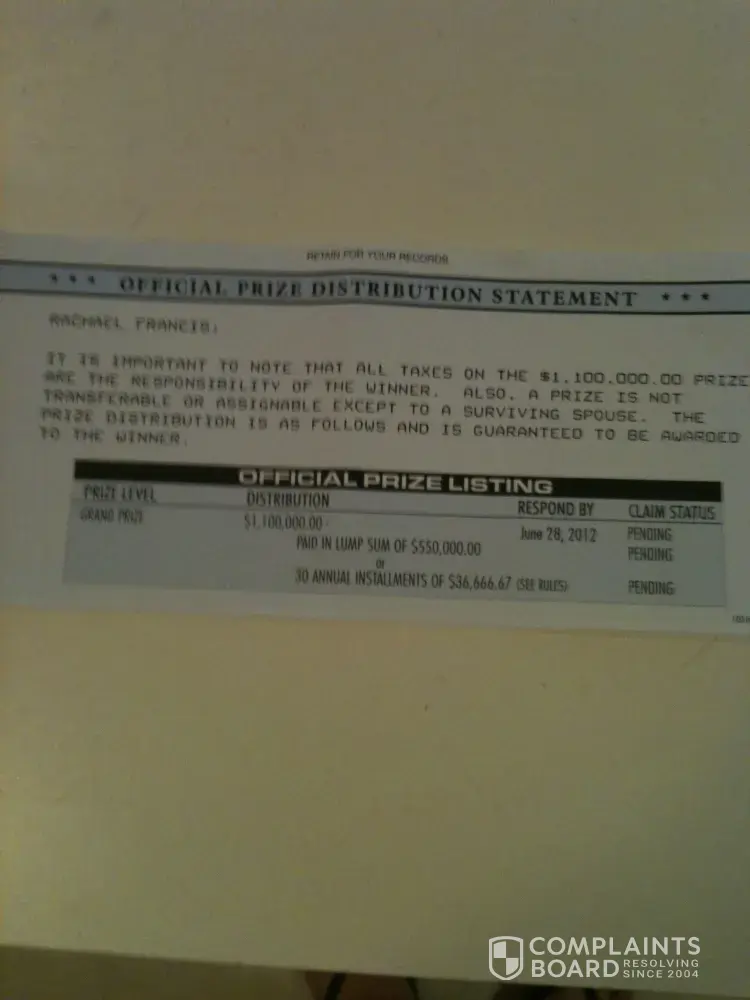 I don't think you ever win any money from them. They seem to be phishing for our information, selling magazines, and offering bogus bonuses. I get tired of getting their letters and endlessly talking to them for nothing.