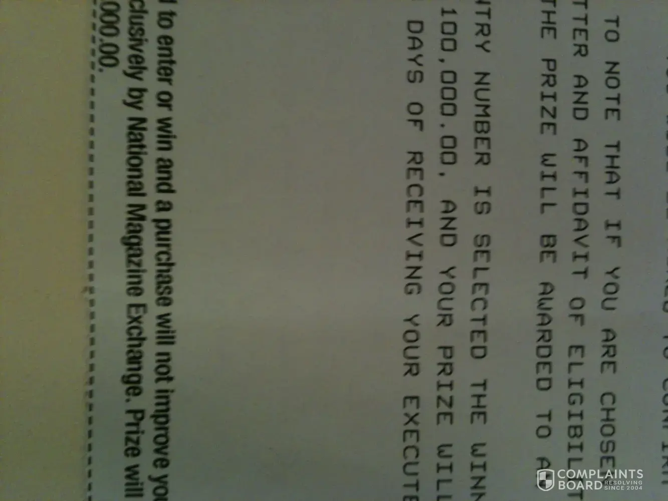 Yes I totally agree with the other review/complaints! This really ticked me off considering the letter states there is NO PURCHASE OR PAYMENT REQUIRED TO ENTER OR WIN! Like the others was rudely pushed with a pretty forceful attitude to hive them my CC # for these magazines that were at first claimed to be free along with a watch. I repeatedly told them Im not interested and they kept going so I had to hang up. Then about a week later I received a bill in the mail for those damn magazines which I obviously was not going to have any part in paying that. I love entering sweepstakes but this one really stood out with a big negative for me. The national magazine exchange is way to pushy and rude and I will always steer clear of anything associated with that name.