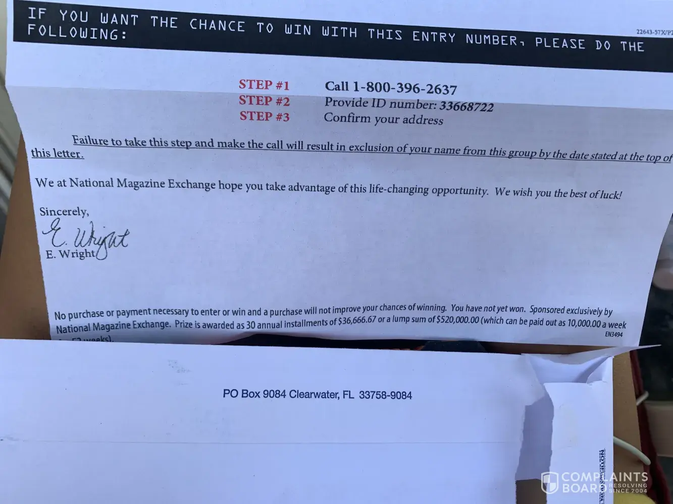 I received a letter yesterday from National Magazine Exchange telling me that I could possibly win a million dollars to call their number to comfirm.