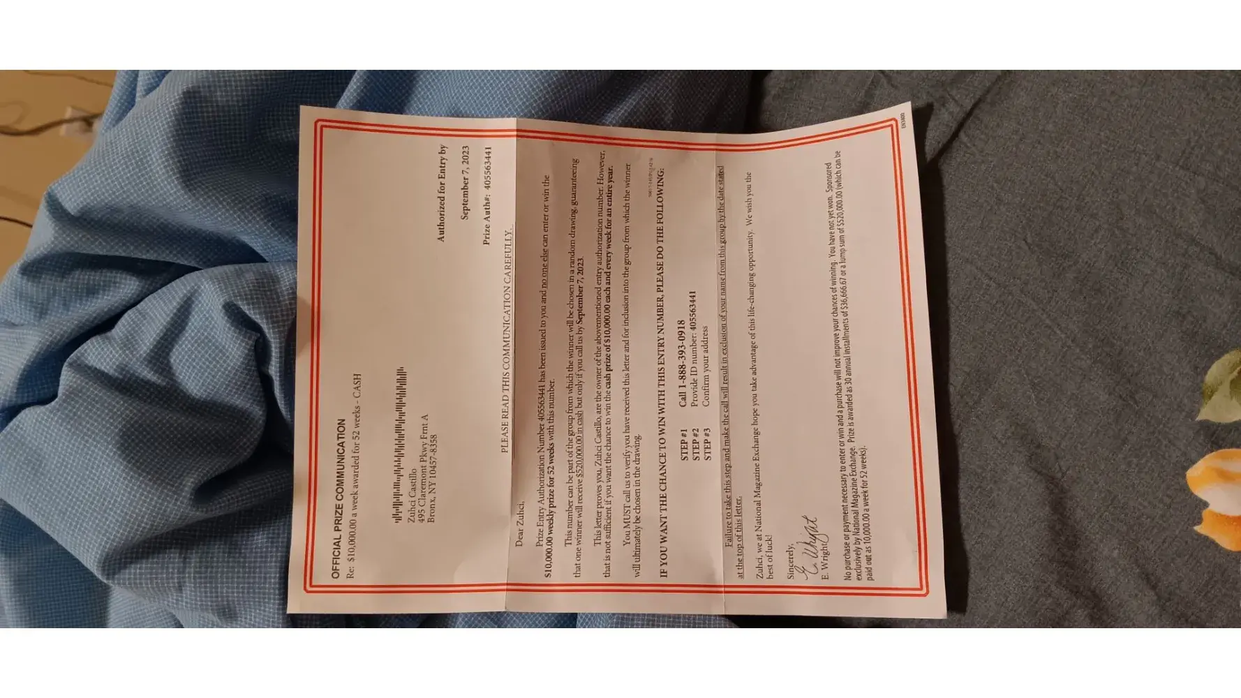 I called that number. The letter at the bottom says no purchase necessary. Still the man I was speaking to just kept pushing me to buy magazines.