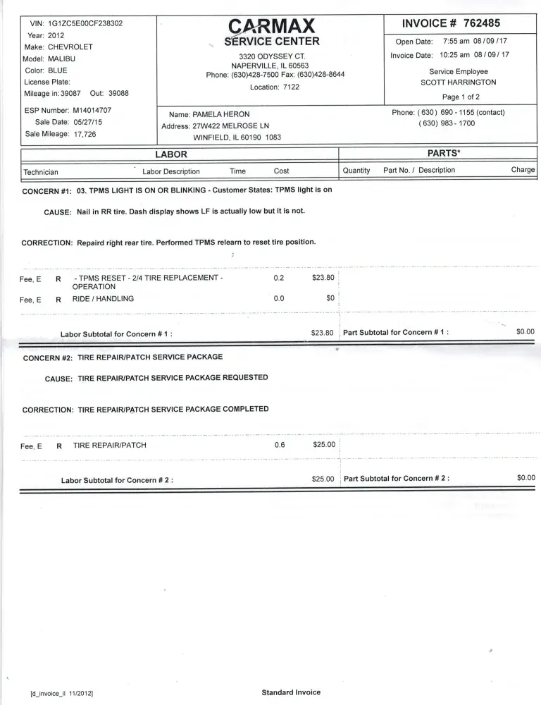 I would like a full refund of $23.80 for the TPMS reset that should have been done at the time the tires were installed.