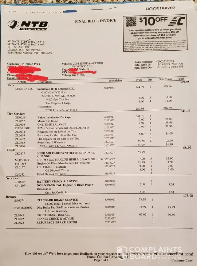 I made a visit to ntb on december 9, 2019 and was given information regarding new tires. I went home that afternoon and my husband and I agreed to go with cooper tires... With that being said I made sure to call on december 10, at around 7:20am to make an appointment for 3:30pm that same day. I even stated that I would be going with the cooper tires. The...