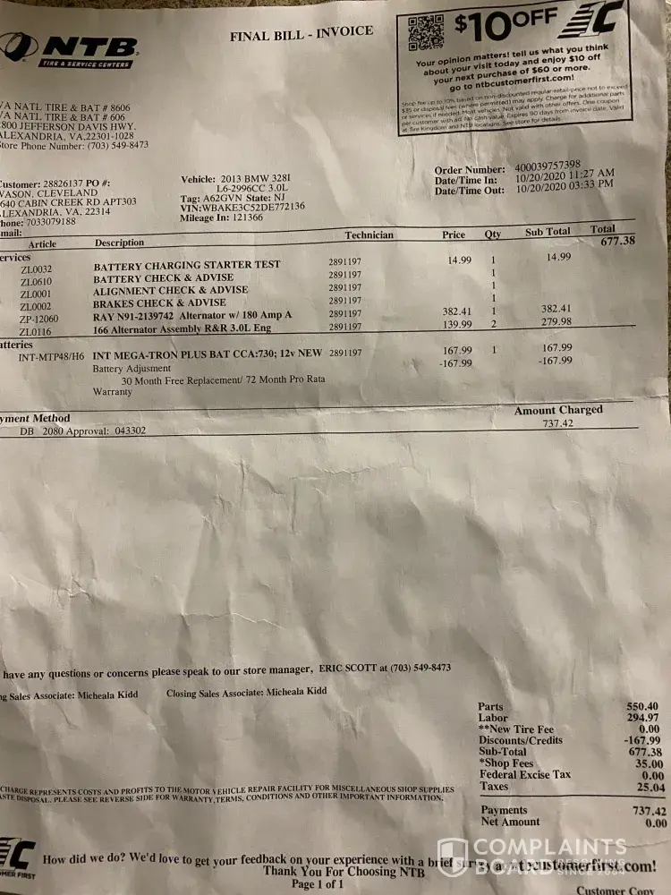 Cleveland Wason 2640 Cabin Creek Apt 303 Alexandria, VA 22314 [protected]) Cleveland. [protected]@gmail.com 29th of October 2020 NTB National Tire and Battery 5800 Edsall Road Alexandria, VA 22304 To Whom it May Concern, I'm writing to you today in hopes of receiving assistance with an issue I experienced at your 2800 Jefferson Davis Hwy Alexandria, VA...