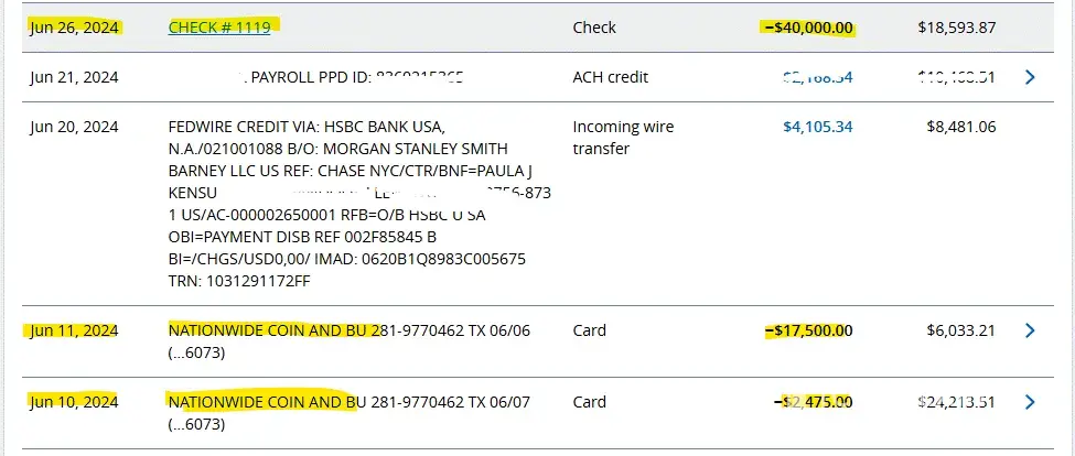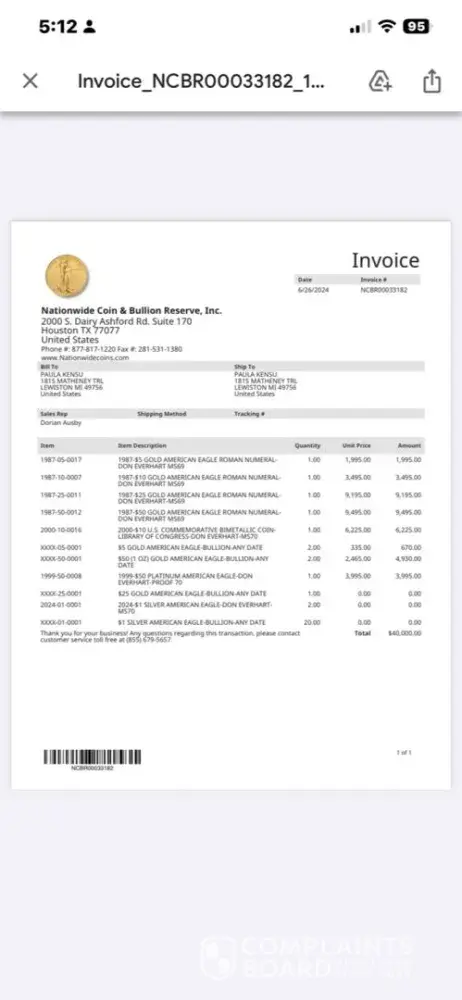 In June 2024, I paid a total of $59,975 (a $40,000 check plus $17,500 and $2,475 debit transfers), documented on invoices #NCBR00032818 and #NCBR00033182 — amounts I was later told were worth only $22,554.61 (and which market quotes show are approximately $32,725.33 today). The receipts are all attached.