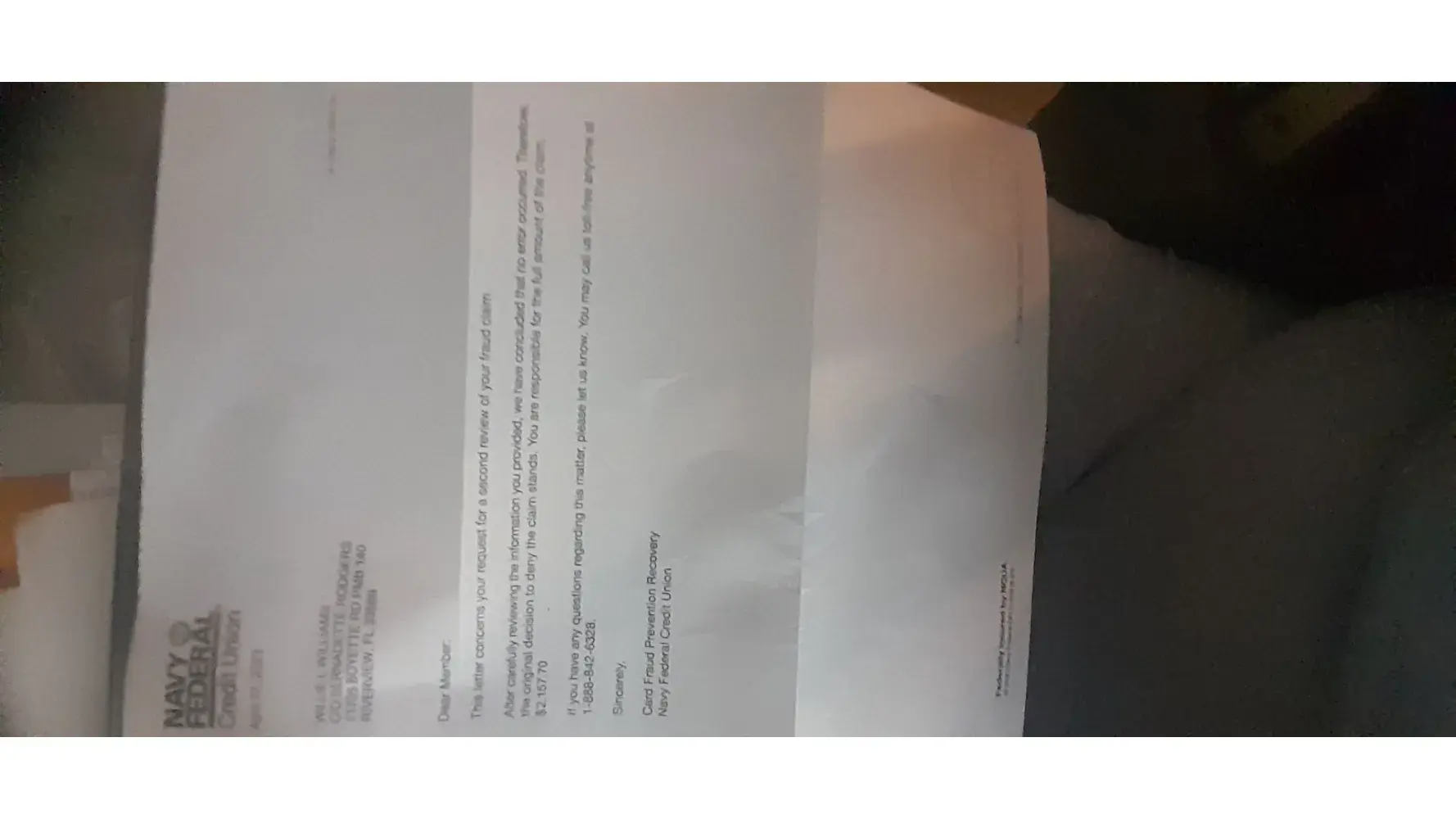 I filed a fraud claim with navy federal credit union (I am using lowercase because your "bot" doesn't allow words in upper case? whatever) because someone from a foreign country had pulled money from my saving account. Get this, they denied it because "There is a chance you might have gone to that country and taken out 600 dollars".