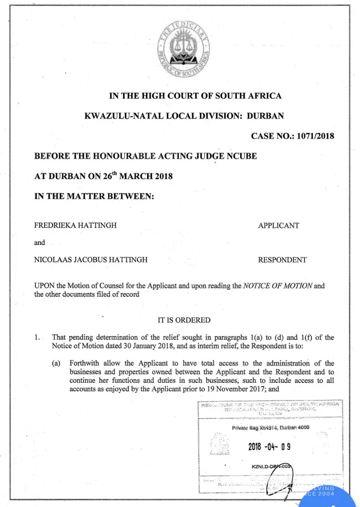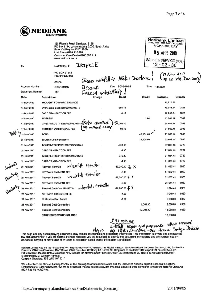 Official Complaint to the Nedbank Head Office laid on 11th June 2018 by Mrs Fredrieka Hattingh who operate certain bank accounts, with yourselves, and specifically has a bank account to which you have allocated number [protected]. Notwithstanding such bank account being in Fredrieka Hattingh's personal name, and there being no other signatories on such account, that on or about the 17th day of November 2017, one of your senior managers informed Mrs Fredrieka Hattingh, that such account was stagnant and accordingly she would not be entitled to make any withdrawals from same, alternatively operate such bank account. Mrs Fredrieka Hattingh remonstrated with (Branch Manager Richards Bay) a Mr Nolan Sundaram, being a dispute between Mrs F. Hattingh and partner, who was dismissive of me furthermore was not prepared to assist Mrs F. Hattingh and indeed added to the hardship I have suffered by not being able to access any of Mrs F. Hattingh 100% owned 2 × Business Accounts registered in my 100% owned Closed Corporation (one being an EAAB Trust Account and my 100% owned Business Account). Notwithstanding such personal bank account allocated number [protected], received confirmation that certain unauthorized withdrawals were made from such bank account, obviously with the full authority of the Branch Manager. The transactions in question are as set out herein: 1) an unauthorized withdrawal in the sum of R40 000.00 on or about the 21st day of November 2017. 2) an unauthorized withdrawal in the sum of R30 000.00 on or about the 21st day of November 2017. 3) an unauthorized withdrawal in the sum of R20 000.00 on or about the 22nd day of November 2017. I have reported the matter to representatives of the South African Police services who are in the process of investigating the matter with a view to prosecuting such parties as participated in the unauthorized withdrawals. The purpose of this correspondence, is certainly not to interfere with such criminal prosecution, however to demand payment from you of the sum of R90 000.00 which monies are to be refunded into my bank account, together with interest from date of such unauthorized withdrawals and furthermore obtain a full written explanation from nedbank, explaining as to why my account was frozen/blocked from Mrs F. Hattingh without notifying Mrs F. Hattingh thereof by nedbank (for having no access ability whatsoever); in the first instance and furthermore why such withdrawals were allowed, without Mrs F. Hattingh consent. There was a High Court Order granted for Mrs F. Hattingh to be reinstated to other nebank Business Accounts of which the nedbank branch manager richards bay, Mr. Nolan Sundaram initially refused to assist Mrs F. Hattingh to be reinstated as Mrs F. Hattingh has been the paymaster of all nedbank businesses accounts were opened around 2005 onwards as Mrs F. Hattingh partner can't send any sms's, emails or do any online banking transactions until after around end of March 2018. Please deal with my lawyer directly; Mr. Philip Walsh at: Email: philip.[protected]@pmwa.co.za ; Furthermore Mrs F. Hattingh forewarn nedbank and reserve Mrs F. Hatting's' legal rights; that as a consequence of such unlawful actions, Mrs F. Hattingh has suffered hardship and being humiliated not being able to maintain medical expenses' or pay a consultation fee when nedbank countermanded payment in a packed Doctors consulting rooms, and is yet to recover all the damages of not being able to sustain monthly outstanding accounts until this day of 11th June 2018 and given that Mrs F. Hattingh was unable to draw funds at a time when such monies required for the institution of legal proceedings, furthermore to sustain Mrs F. Hattingh, in circumstances, which nedbank branch manager richards bay, Mr. Nolan Sundaram was fully advised of and did not assist Mrs. Fredrieka Hattingh at all. In the premises, Mrs F. Hattingh notify you that my lawyer, Mr. Philip Walsh at: Email: philip.[protected]@pmwa.co.za will proceed with the institution of proceedings for the sum of R90, 000.00 together with interest as from date of such withdrawals, should NEDBANK not have refunded same immediately or certainly within the next five days as from 11th June 2018. Our clients' rights to Institute proceedings against nedbank in respect of the damages which she has suffered, as well as to address the matter with the banking Ombudsman are reserved. Attached: 1) Mrs Fredrieka Hattingh personal bank account allocated number [protected] showing unlawful withdrawals. 2) Proof of Mrs Fredrieka Hattingh personal bank account allocated number [protected].3) High Court Order to reinstate Mrs Fredrieka Hattingh in bank accounts prior to 19th November 2017 being the paymaster since inception of all Businesses.