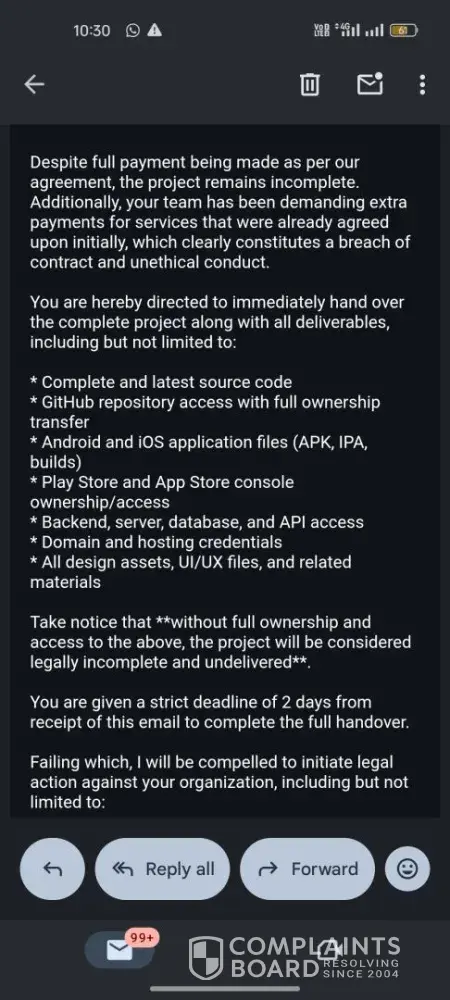 When I requested them to either complete the project or refund my money, they started threatening me with legal action instead of resolving the issue. This behavior appears to be highly unprofessional and misleading.