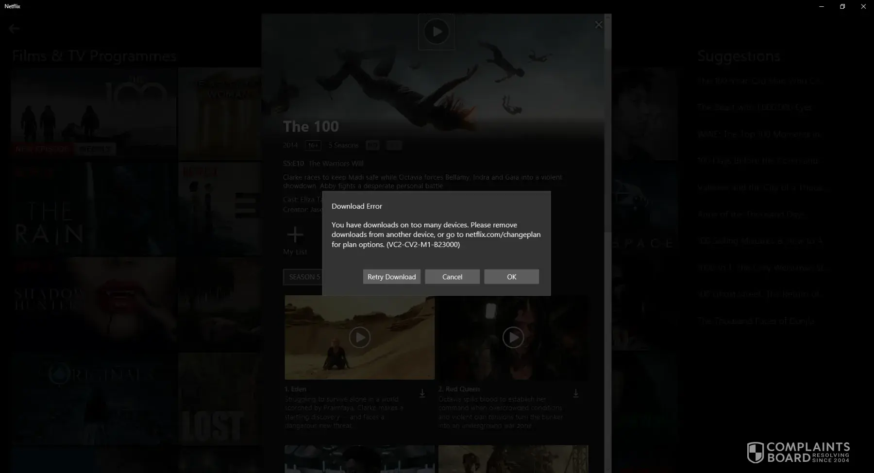 You have downloads on too many devices. Please remove downloads from another device, or go to netflix.com/changeplan for plan options. (VC2-CV2-M1-B23000)".