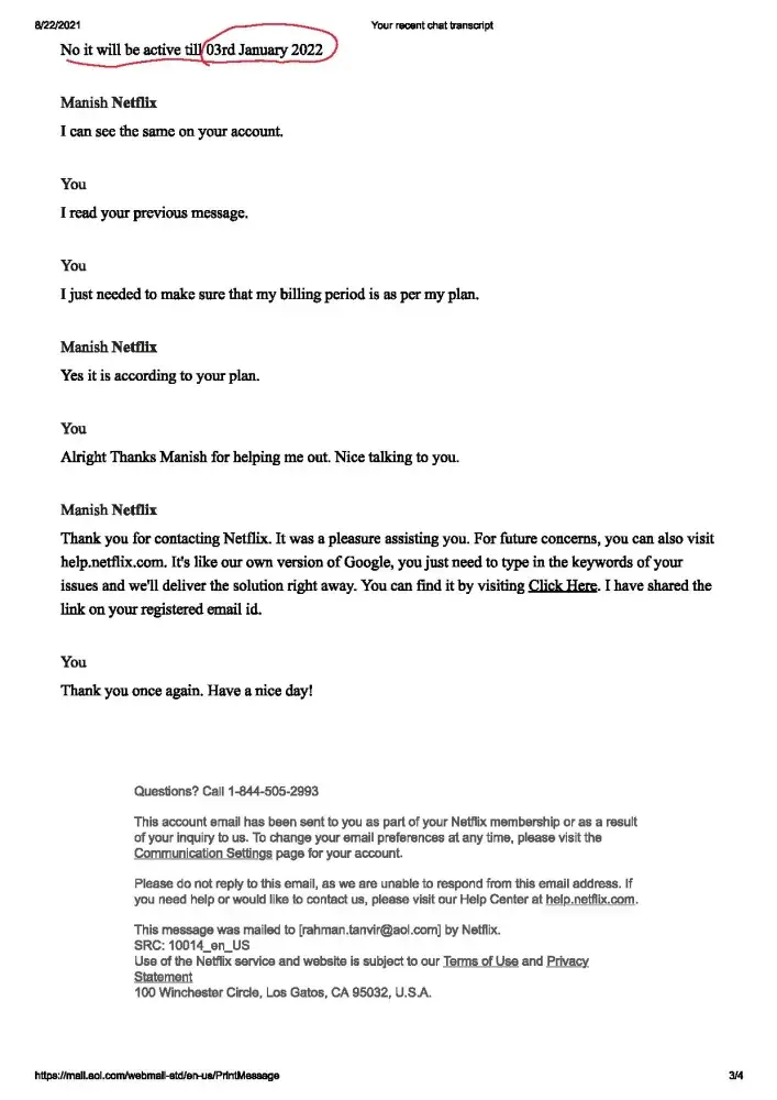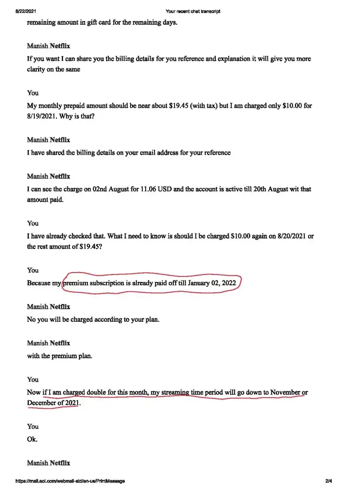 For convenience, I have attached my current billing copy and a conversation with the Netflix customer support person who ensured me that my Netflix premium plan will long for January 2022 (which is obviously not as per my billing info). I marked pg. 2 and 3 of the conversation details to bring into notice the variance between the statement of the customer support representative and my billing info.