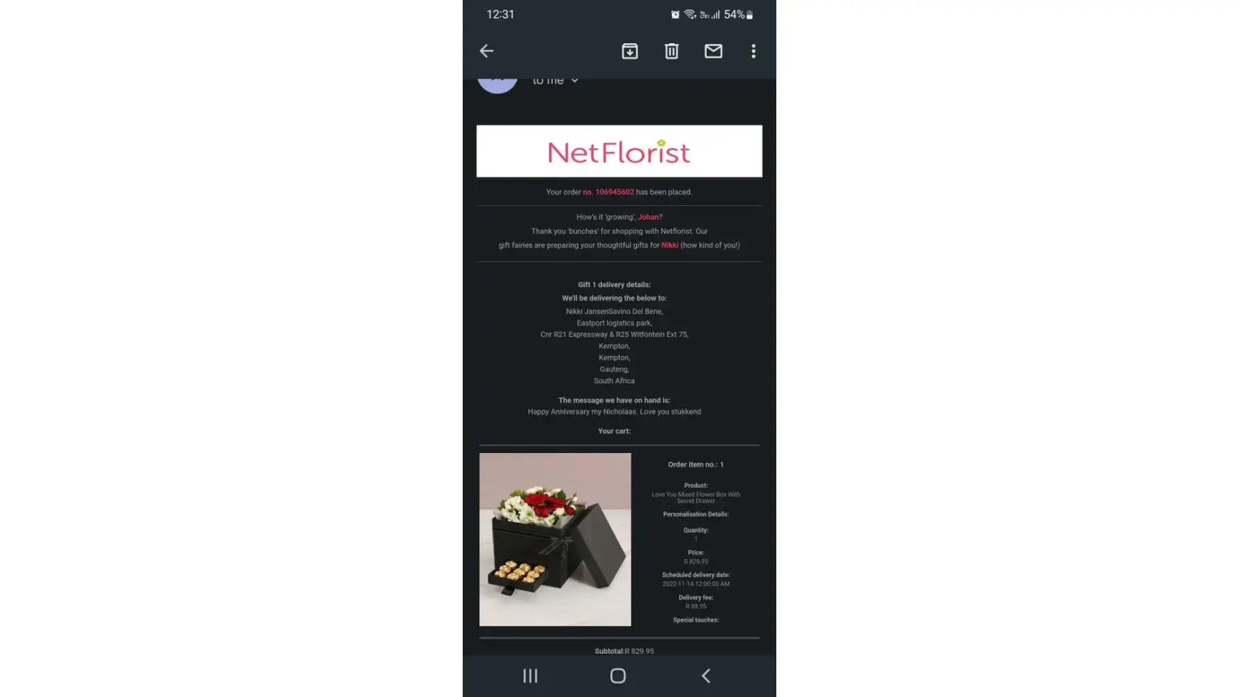Flowers and box of Lindt chocolates and a personal message were ordered yesterday ( 06/12/2022) for my mother. The matron of the old age home (Frailcare) informed me that the gifts were delivered but that there was no message for whom it was. The flowers was placed in a vase and she had to throw away the chocolates because it was melted and wet. The matron even made contact with the Neflorist office and no one had an idea for whom it was. I have an email that confirms that the order was delivered to my mother. So I have no idea why the Neflorist office don’t even know for whom this gift was for. This is very poor business.