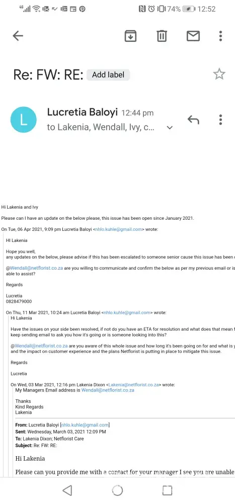 The last comms she sent was on 23 Feb as attached here, ever since no response, I have been asking for feedback, added her manager, the customer service team and other people that were initially on the mail trail and to date I still haven't received any feedback.