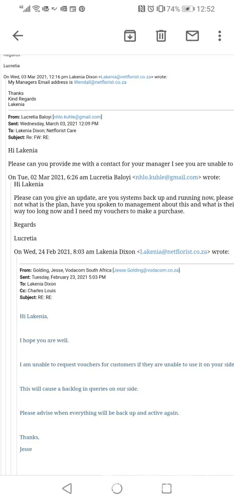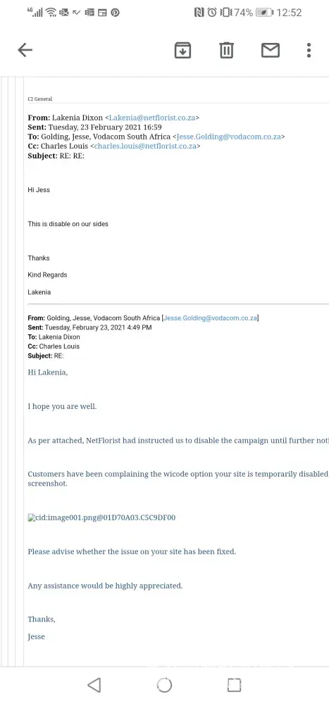 I won vouchers from Vodacom in January through their Vodacom/Netflorist campaign, but due to issues on the netflorist side I was unable to use these voucher codes and was told by their agent that I would still be able to use them after they expire, I have been following up with their agent and the last I was told was Netflorist had instructed vodacom to disable - Vodacom agent said "Netflorist had instructed us to disable the campaign until further notice for V-Day,