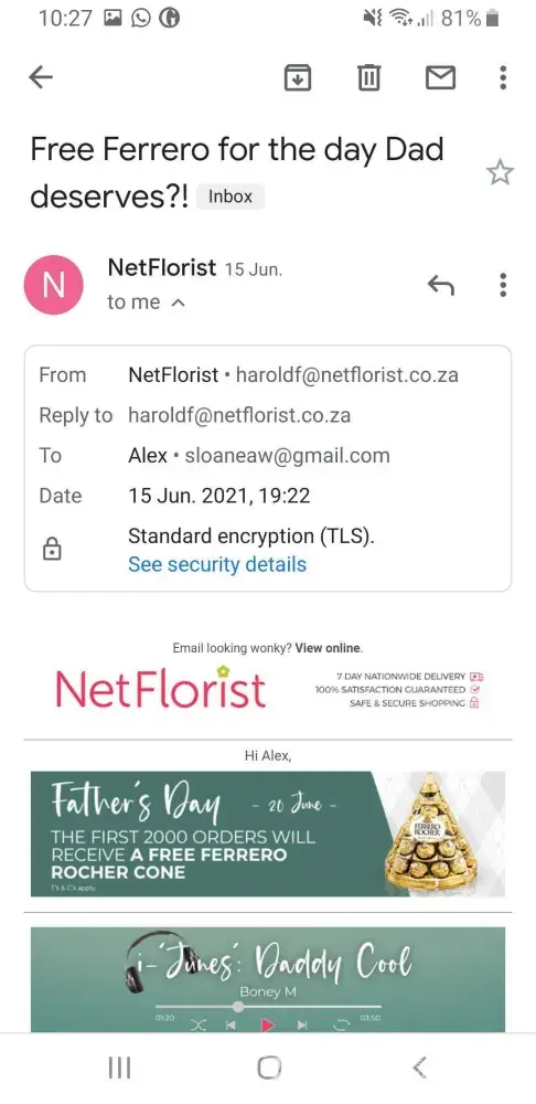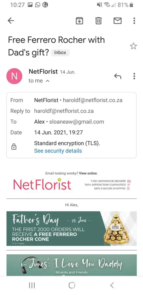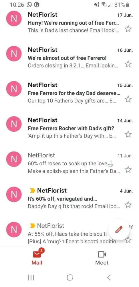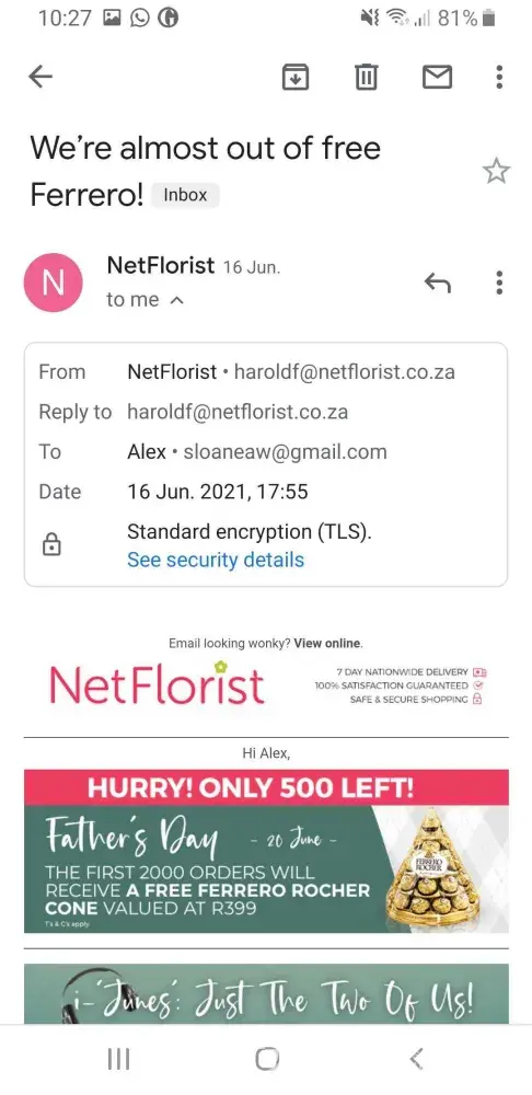 I opted out from receiving emails from the NetFlorist website on 2 occasions and replied to emails from the company requesting to be unsubscribed, most recently in the middle of May. Since this time I have received more than 8 emails from them (only 8 saved in my inbox at the moment). I would like to be removed from their mailing list and for them to be fined for their breach. Email address [protected]@netflorist.co.za