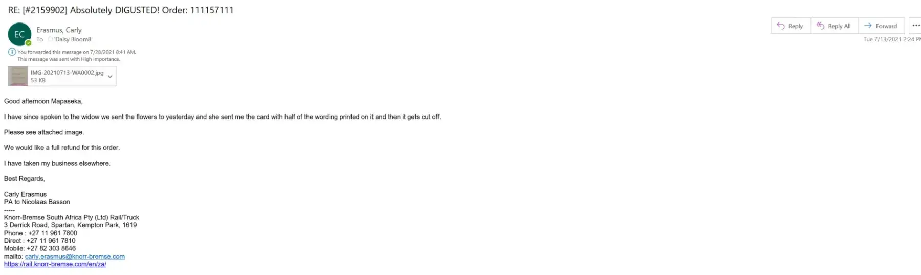 I am writing today to complain of the poor service I received from your company on the 28th of April 2021. I ordered roses for Name of receipient, delivery was scheduled for the same day in the afternoon but the order never arrived hence the cancellation.