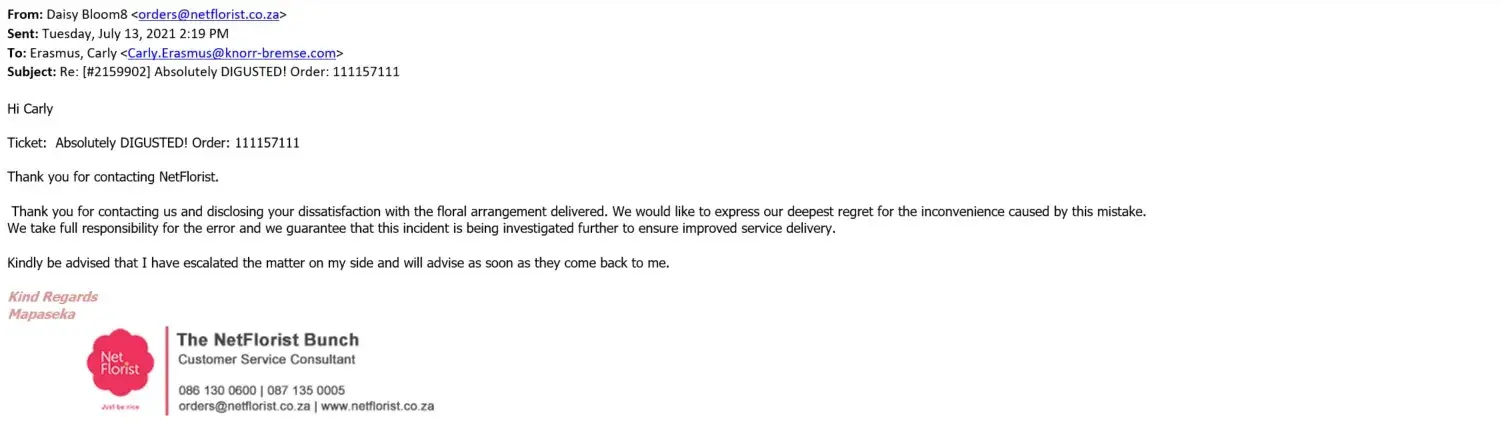 Considering the exorbitant prices that customers pay for the products and service which we expect to be prompt and as stipulated on the order, it is disappointing that NetFlorist does not keep to its promise and arrangement as paid for by the customer.