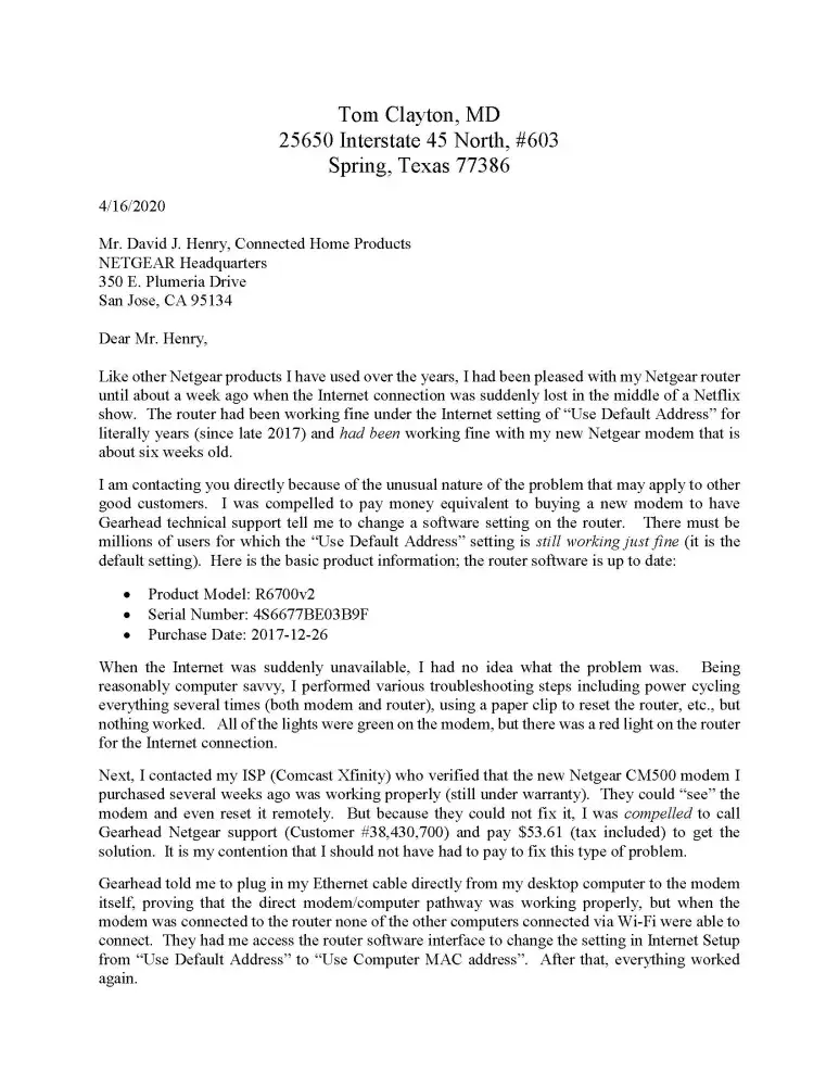 A few weeks after I purchased a Netgear CM500 modem it stopped working but when I contacted my ISP (Comcast Xfinity) they verified that it was working properly (still under warranty). They could "see" the modem and even reset it remotely. But because they could not fix it, I was compelled to call Gearhead Netgear support (Customer #38, 430, 700) and pay $53.61 (tax included) to get the solution. It is my contention that I should not have had to pay to fix this type of problem.