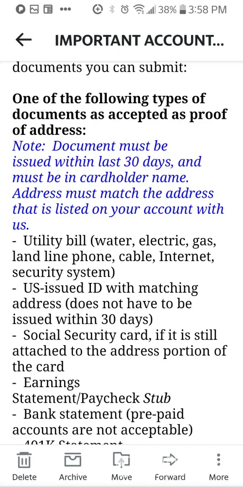 Note: Document must be issued within last 30 days, and must be in cardholder name. Address must match the address that is listed on your account with us.
