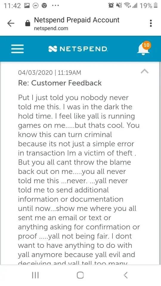 I initially file a dispute with netspend on March 19, 2020. It was several unauthorized transactions done by Cricketwireless and I wanted dispute by netspend. Netspend customer service or netspend dispute department never verbally or through email asked me for written confirmation or additional information toward my dispute. They never said Mrs Duggan you have 10 days to send us written confirmation or additional information so we can temporarily credit $63 back into my account they purposely kept that information and just gave me a bunch false hope telling me over the phone to be patient and we will credit the money by 04/02/2020. Its not cool to miscommunication with a customer, it's not cool to say they that going to do something and nothing do it and leave me in the dark on alot of thing. If they would of verbally told me on the phone or through email that they needed a written confirmation don't you think I would of gave it to them... they never told me that... out of consideration they could sent me the document through email they have my email address... today is my first time even hearing from the dispute department...