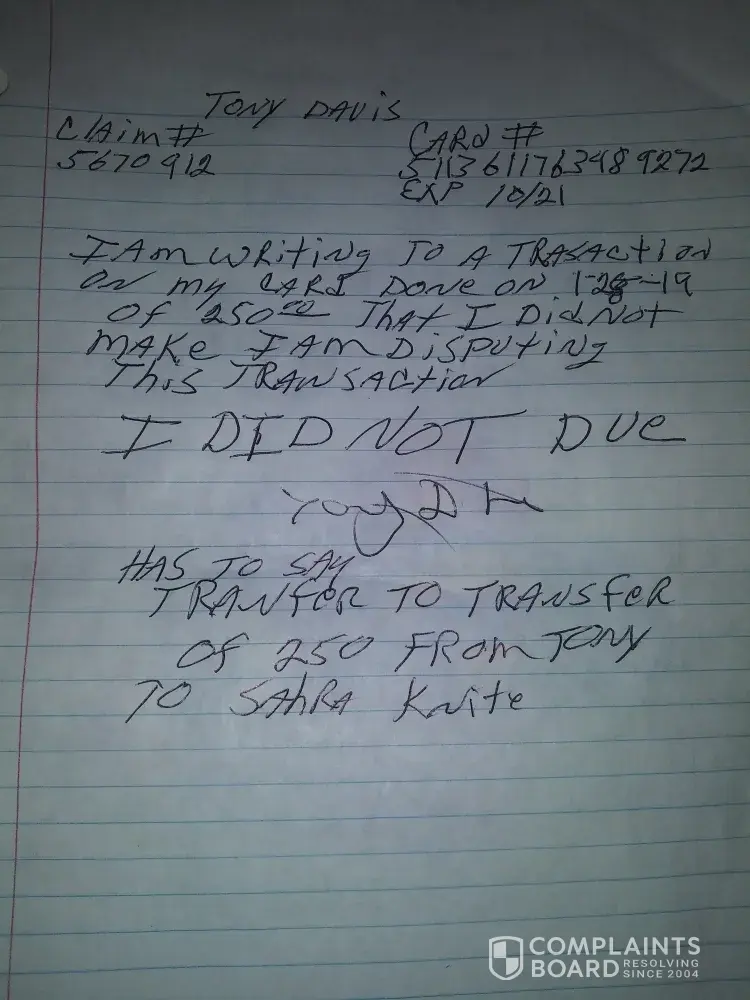 I Tony Davis am writing in regards to an unauthorized transfer/transaction which was done on 1/28/19 in the amount of $250.00 using card number [protected] including expectation date 10/21 and claim number 5670912. The transfer was sent to "Sara Knight" by a unknown source and need this disputed and resolved immediately please.