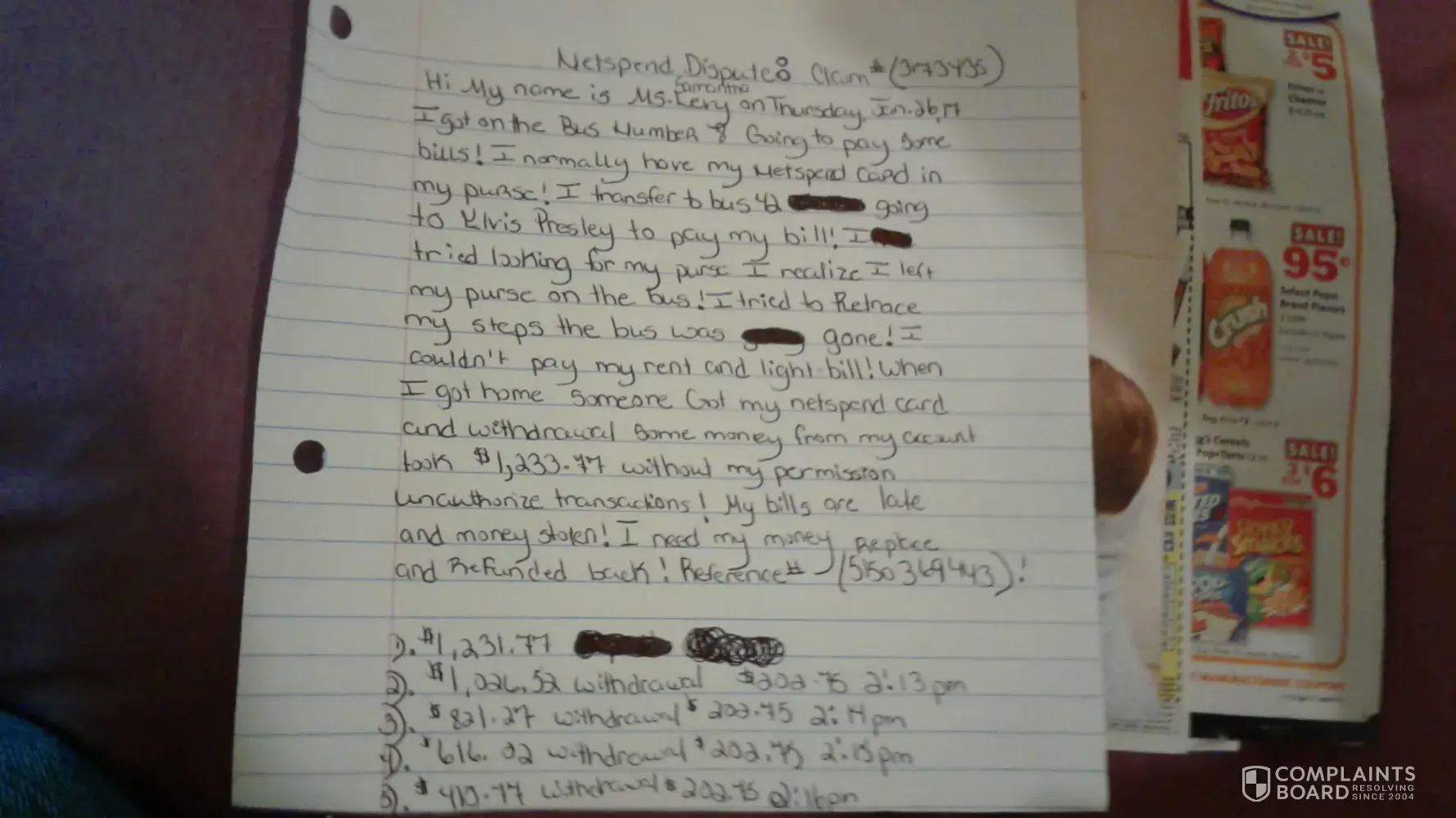 My name is Samantha Levy And my claim #( 3173435) And reference #([protected])! On Thursday, January 26, 17 I got on the bus 8 going to pay some bills! I normally have my Netspend Card in my purse! I transferred to bus 42 going to Elvis Presley to pay my bills! I tried looking for my purse I realized I left my purse on the bus! I tried to retrace my steps the bus was gone! I couldn't pay my rent and light bill! When I got home someone made Some Unauthorized Transactions money from my account without permission! $1, 233.77 was stolen from my Netspend Card account! Y'all said Y'all going to Refund my money back I still haven't gotten my money back from Netspend!