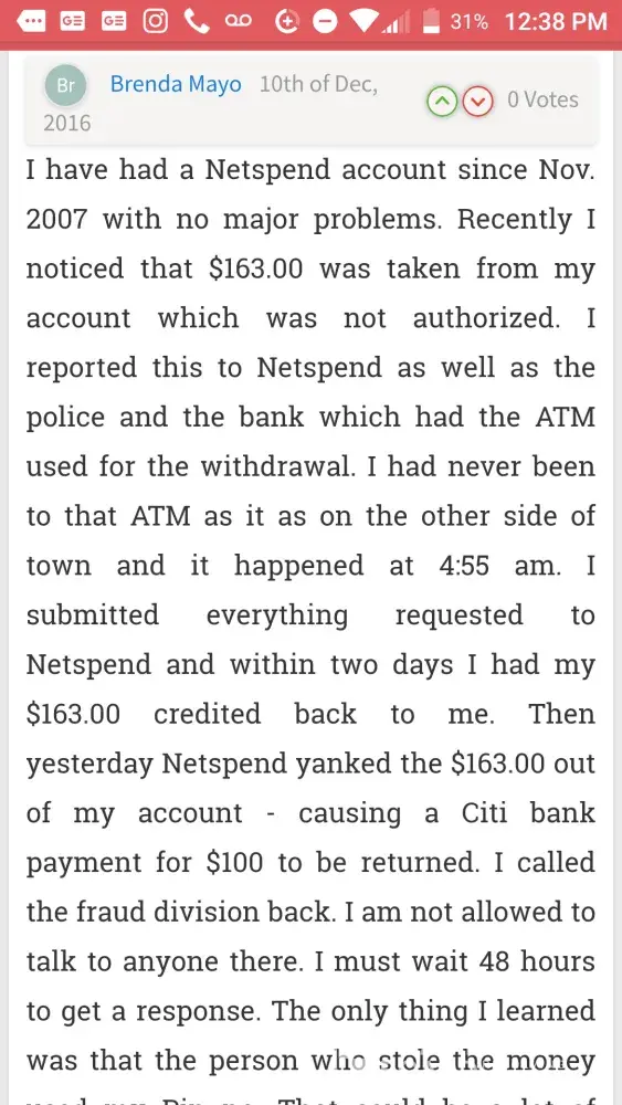 I have had a Netspend account since Nov. 2007 with no major problems. Recently I noticed that $163.00 was taken from my account which was not authorized. I reported this to Netspend as well as the police and the bank which had the ATM used for the withdrawal. I had never been to that ATM as it as on the other side of town and it happened at 4:55 am. I submitted everything requested to Netspend and within two days I had my $163.00 credited back to me. Then yesterday Netspend yanked the $163.00 out of my account - causing a Citi bank payment for $100 to be returned. I called the fraud division back. I am not allowed to talk to anyone there. I must wait 48 hours to get a response. The only thing I learned was that the person who stole the money used my Pin no. That could be a lot of people but I was told I can't see the video footage of the drive thru ATM because only the police or Netspend can request it from the bank and both declined to do so. I feel like I have been robbed twice! I have researched the Consumer Financial Protective Bureau and the FCRA (Fair Credit Reporting Act). You cannot be held responsible for more than $50 if you report this within two days (which I did) but the longer you wait the bigger your liability. ALWAYS FILE A DISPUTE and/or take them to court. You could get up to $1000! They must investigate your dispute or they can be fined and they must give you notice of their findings WHICH THEY DID NOT DO BEFORE JERKING MY $163 OUT OF MY ACCOUNT. I was a paralegal for 25 years and I will sue the bas****ards!